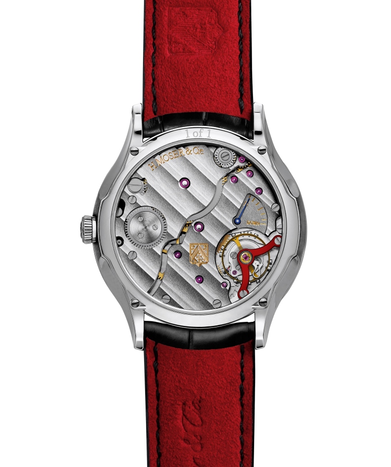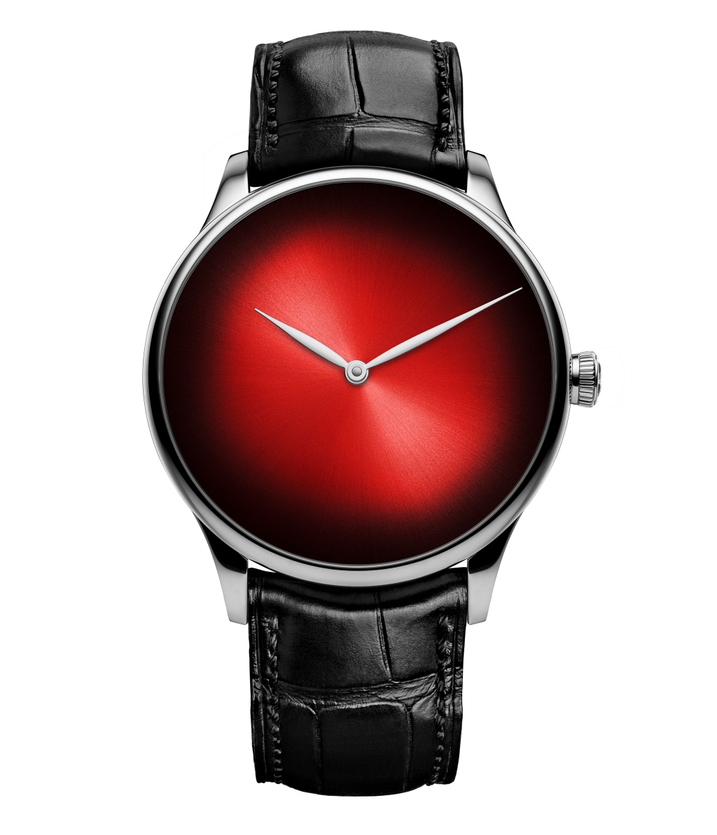 Помимо красного циферблата, созданного в фирменной технике fumé (с градацией цвета и солнечной фактурной шлифовкой), в красном цвете выполнен и мост баланса мануфактурного калибра HMC 327 с ручным заводом и 3-дневным запасом хода, отличительной чертой которого является балансовая спираль Straumann со стабилизированным витком Бреге.