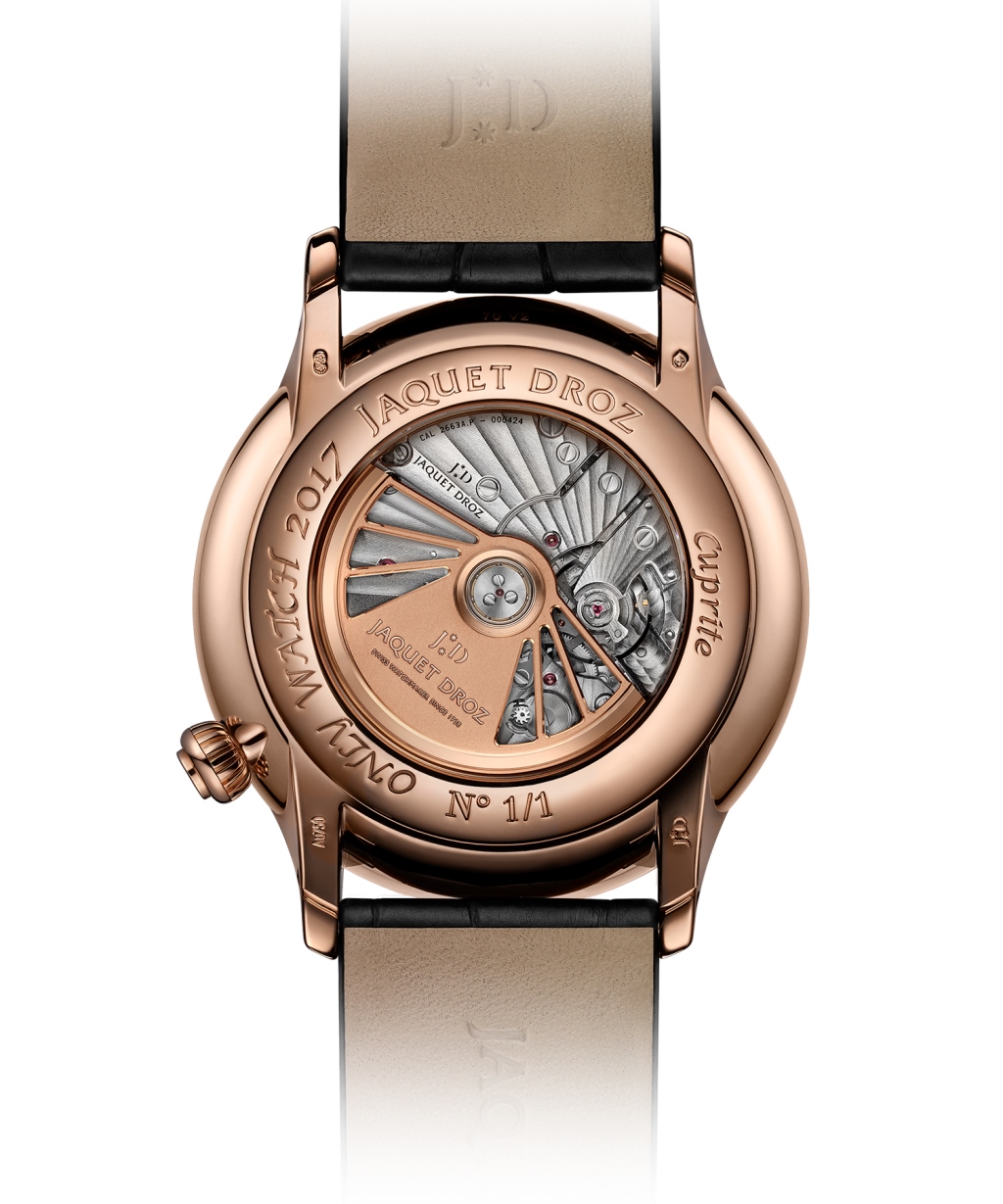 Задняя крышка корпуса снабжена ручной гравировкой «1/1» и «Only Watch 2017 Cuprite», а сапфировое стекло дает представление о механической начинке изделия — это автоматический механизм Jaquet Droz 2663A.P (базовый калибр — Frederic Piguet 1150) с кремниевой спиралью баланса и запасом хода в 68 часов.