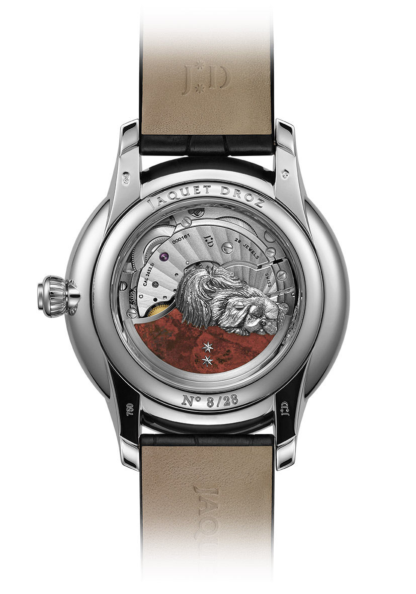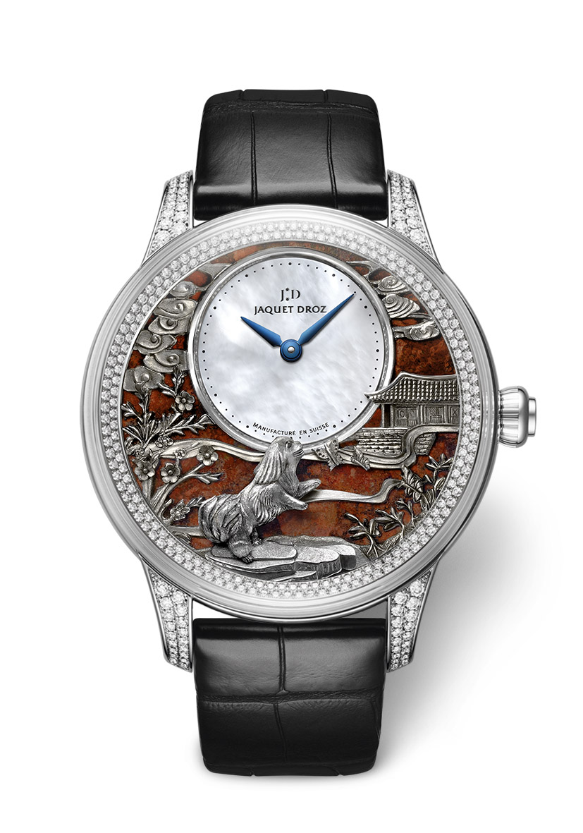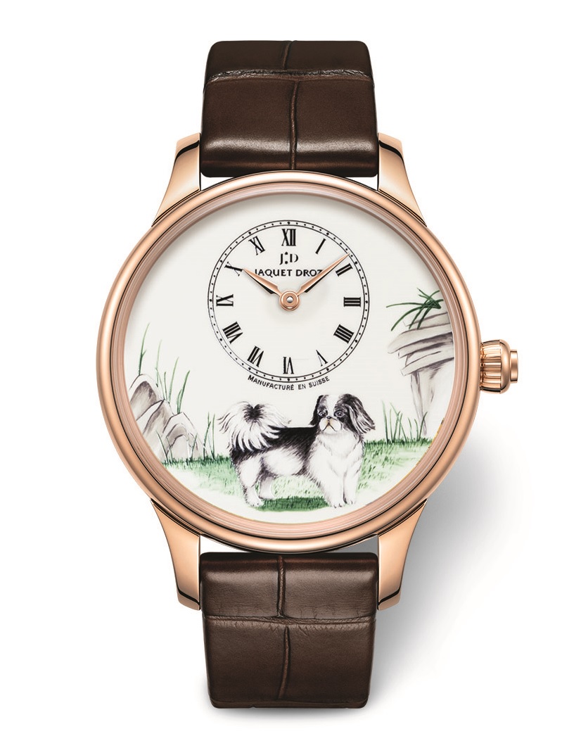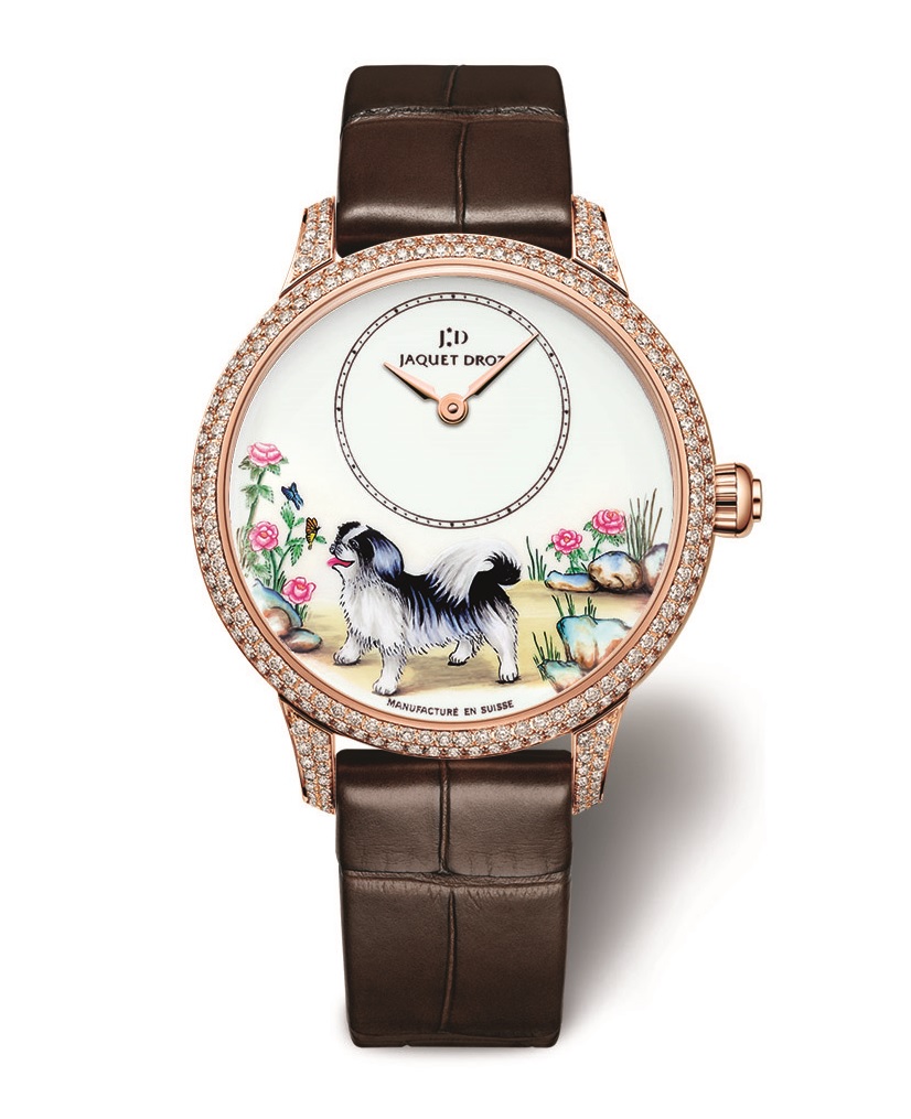 Вдохновившись этими качествами, мастера Ла Шо-де-Фон изобразили сценки из жизни пекинеса, представляющие собаку во всем ее великолепии: корпус диаметром 35 мм из розового золота с инкрустацией бриллиантами и корпус диаметром 39 мм из розового золота без инкрустации украшены двумя нарисованными миниатюрами.