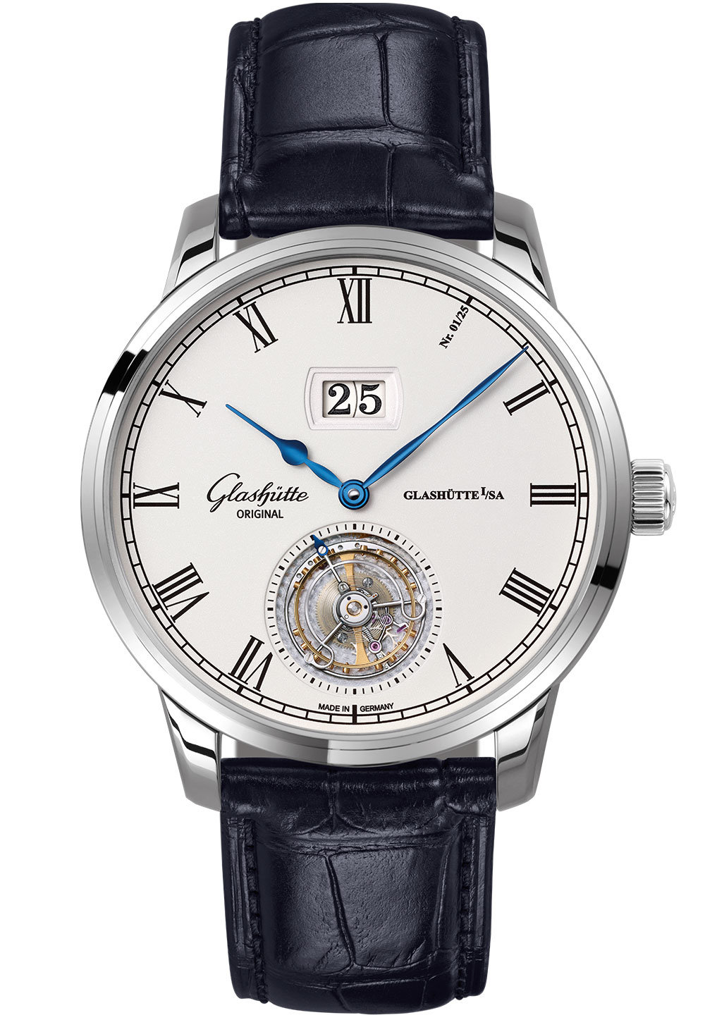 Саксонская марка порадовала своих поклонников лимитированным изданием модели Senator Tourbillon, премьерный показ которой состоялся еще на BaselWorld-2013, когда на суд публики предстали часы с черным циферблатом.