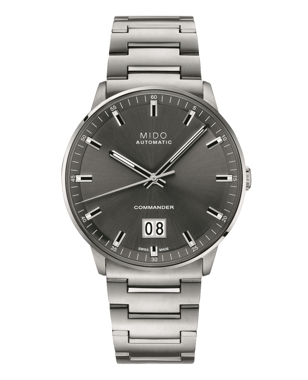 В арсенале Commander Big Date кожаные ремешки и стальной браслет, три расцветки циферблата (серая, черная и серебристая), а также любопытный биколорный вариант с использованием золотого PVD-покрытия.