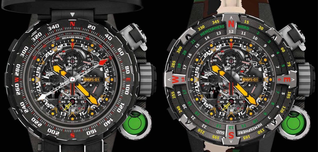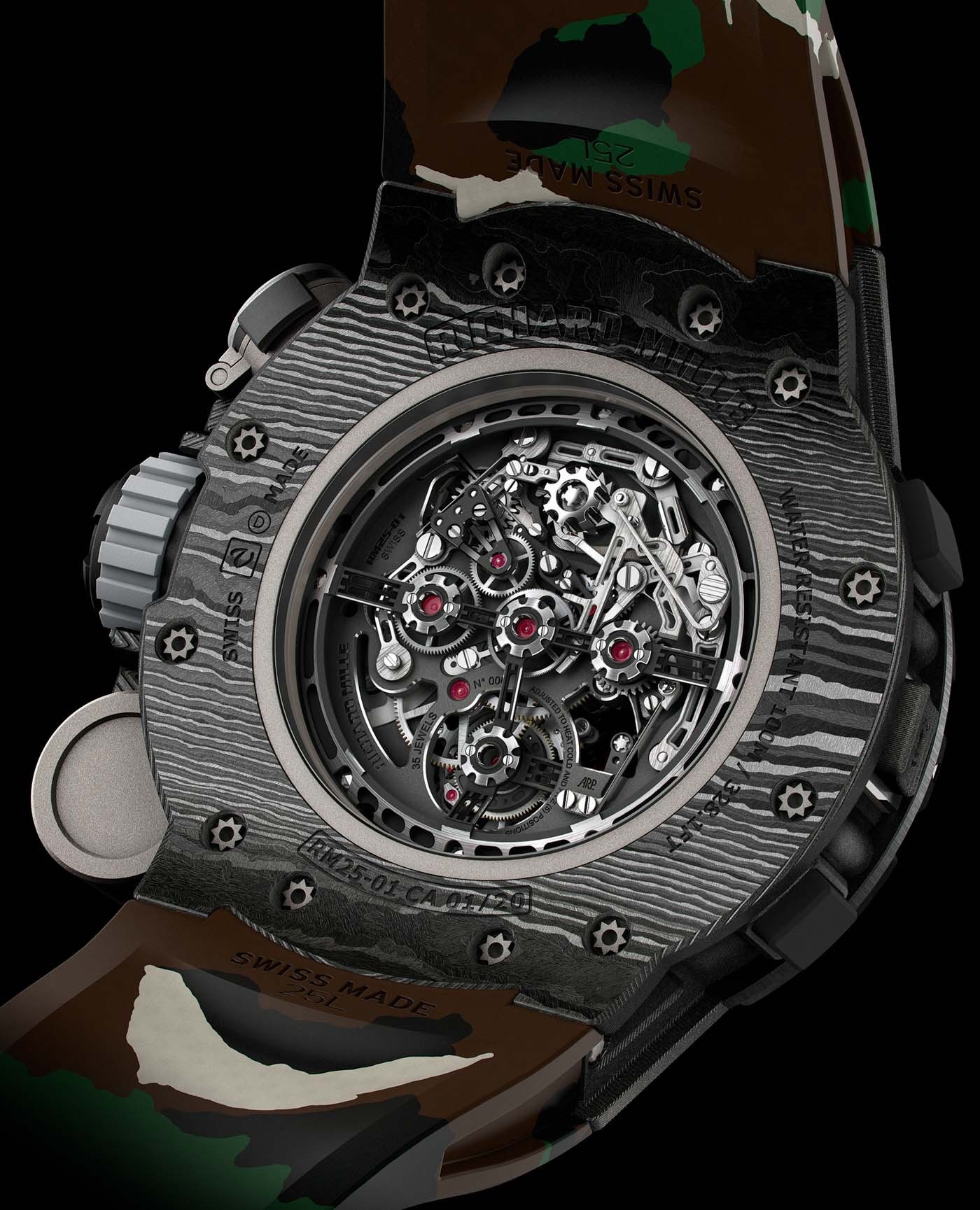 Что до часовых функций, то наряду с индикацией часов и минут на 24-часовой шкале, RM 25-01 предлагает минутный турбийон, хронограф с центральной секундной стрелкой и 30-минутным накопителем, а также указатели запаса хода, крутящего момента на валу заводного барабана и селектора режима работы заводной коронки N-W-H.