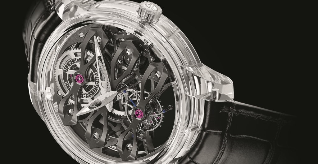 Неутомимые мастера из Ла Шо-де-Фон, что в этом году устремили взгляд в небо, объединив свои новые творения под общей темой Earth to Sky, не перестают удивлять: из стен старинной фабрики вышла модель Quasar, заключающая скелетонизированный калибр Neo-Tourbillon с тремя мостами внутри полностью сапфирового корпуса.