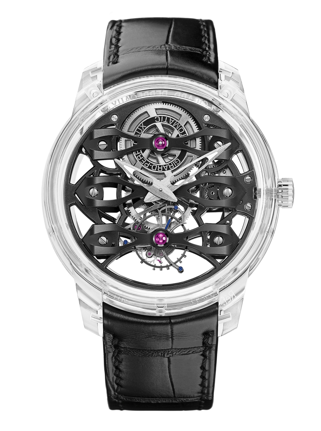 Автоматический калибр GP9400-1035 (с микро-ротором, расположенным соосно заводному барабану) характеризуется 3-герцовым балансом, запасом хода в 60 часов и запоминается своими объемными титановыми мостами с пескоструйной обработкой и черным PVD-покрытием — они являются основой общего темного образа механической начинки изделия, что контрастирует с прозрачной сапфировой оболочкой.