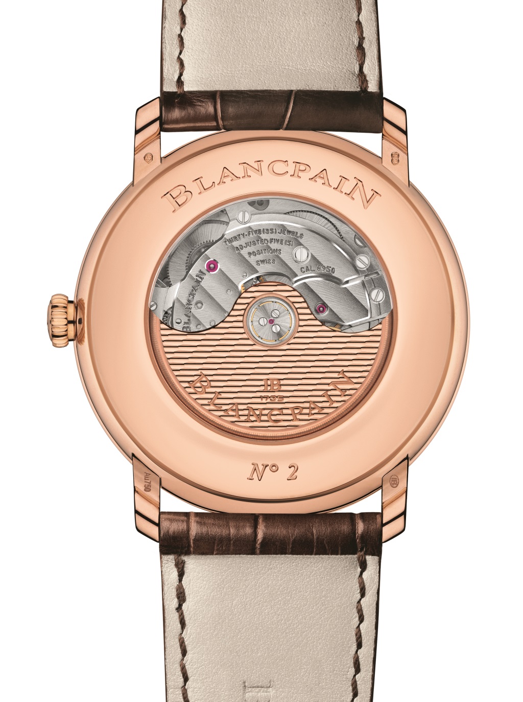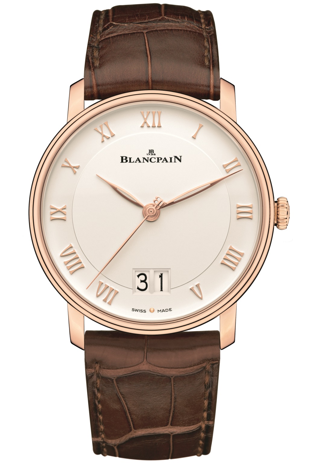 Спокойные классические часы коллекции Villeret выполнены в корпусе диаметром 40 мм и толщиной 10.88 мм, материал — 18-каратное розовое золото, водонепроницаемость — 3 bar. Циферблат опалиновый с накладными золотыми часовыми метками в виде римских чисел. Стрелки типа «листок» изящно скелетонированы в центральной части, противовес секундной стрелки стилизован в виде инициалов JB. Сапфировое стекло в задней крышке корпуса открывает взгляду наблюдателя автоматический калибр Blancpain 6950.