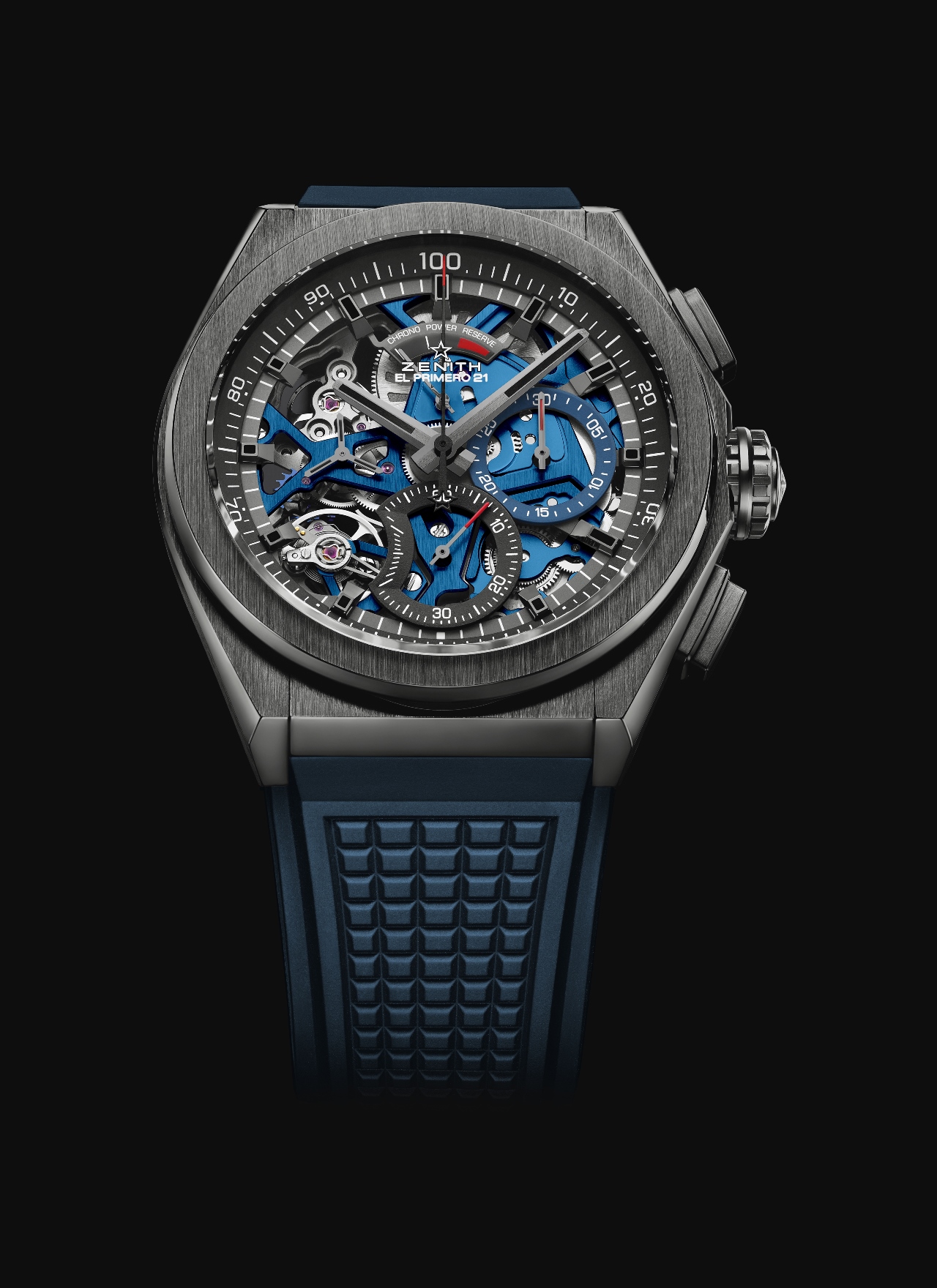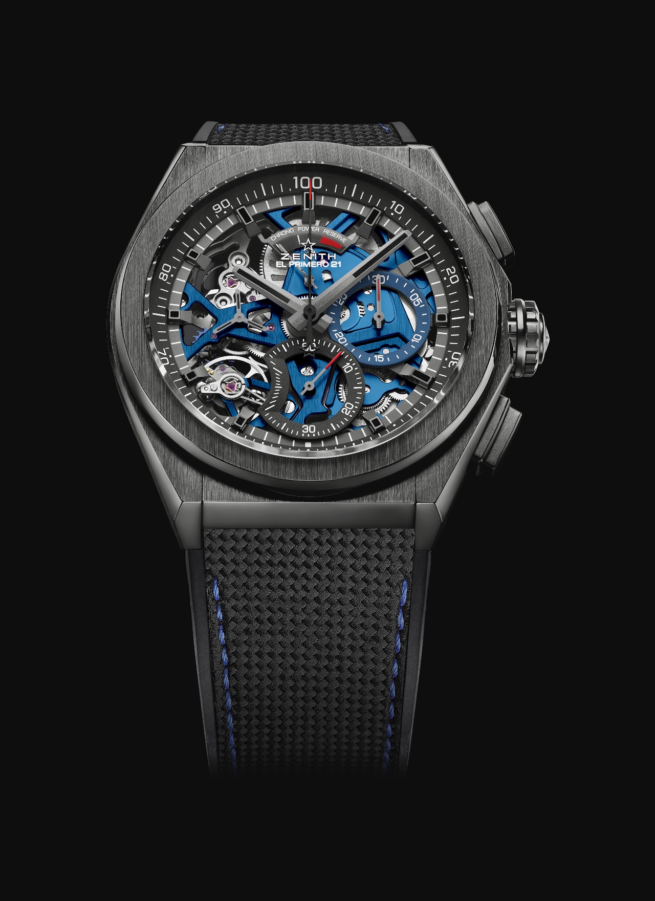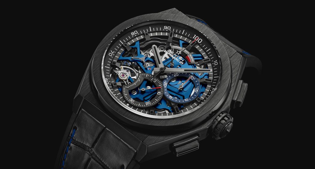 Последняя новинка фабрики из Ле Локля использует сочетание конструктива из черной керамики с открытым циферблатом и скелетонизированным калибром, платина, мосты и ротор автоподзавода которого выполнены в ярком цвете Zenith Blue.