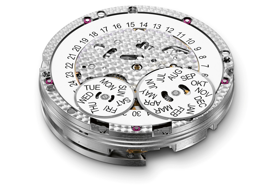 Календарный модуль смонтирован поверх калибра, относящегося к новому семейству мануфактурных механизмов под обозначение 52000, с двумя заводными барабанами и 7-дневным запасом энергии, а также фирменной системой двунаправленного автоподзавода Пеллатона. Использование двух заводных барабанов является залогом высокого крутящего момента, что особенно ценно в механизмах с календарными функциями — для быстрого перевода дисков-указателей.