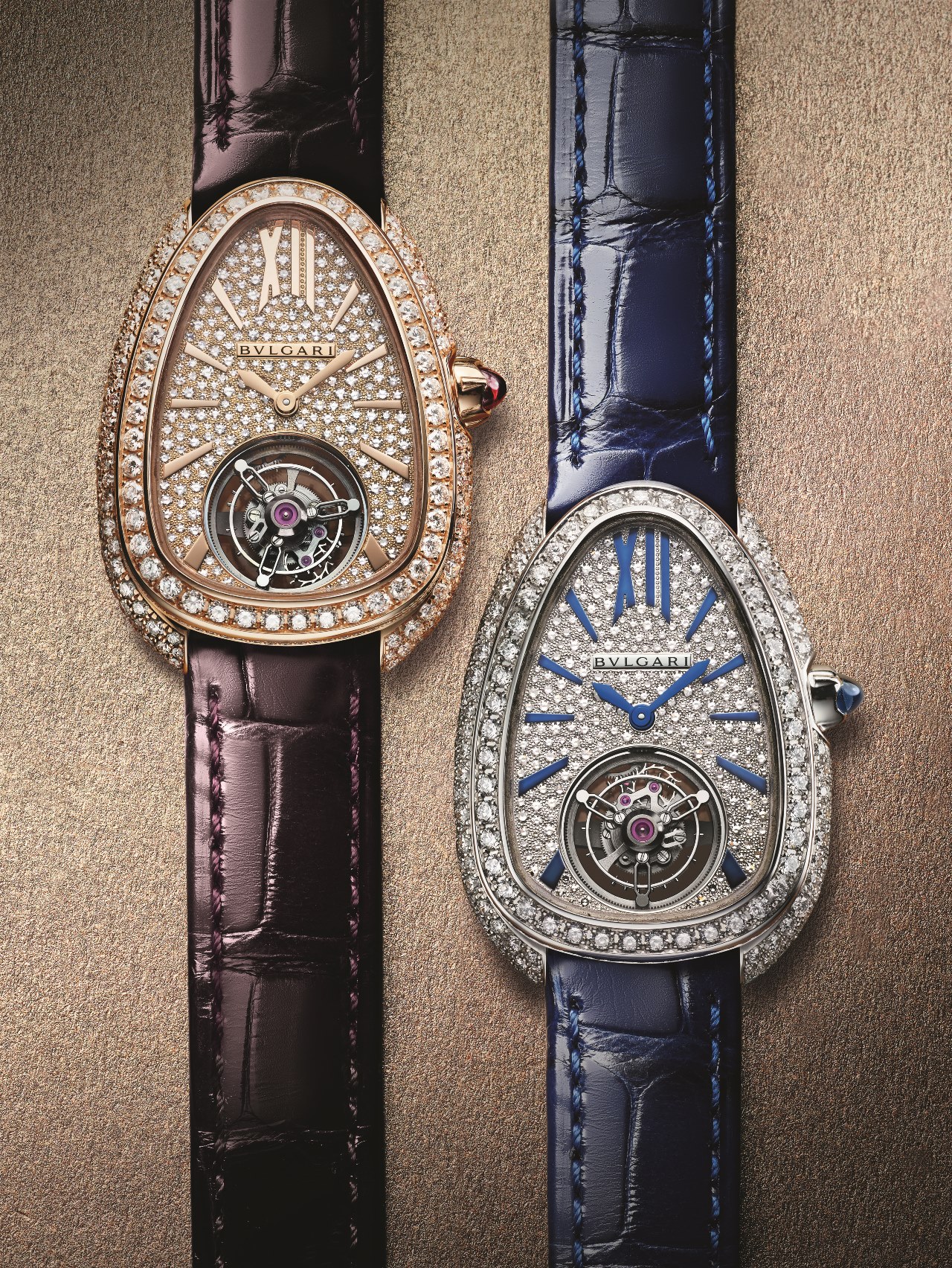 Отметим, что помимо пары версий Serpenti Seduttori Tourbillon, предлагаемых на глянцевых ремешках из кожи аллигатора коричневого либо синего цвета, марка представила и версию Full Diamonds с браслетом из белого золота, полностью инкрустированным бриллиантами общим количеством в 558 единиц (7.89 карат).