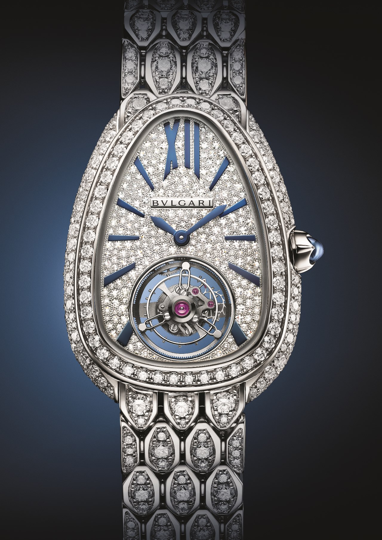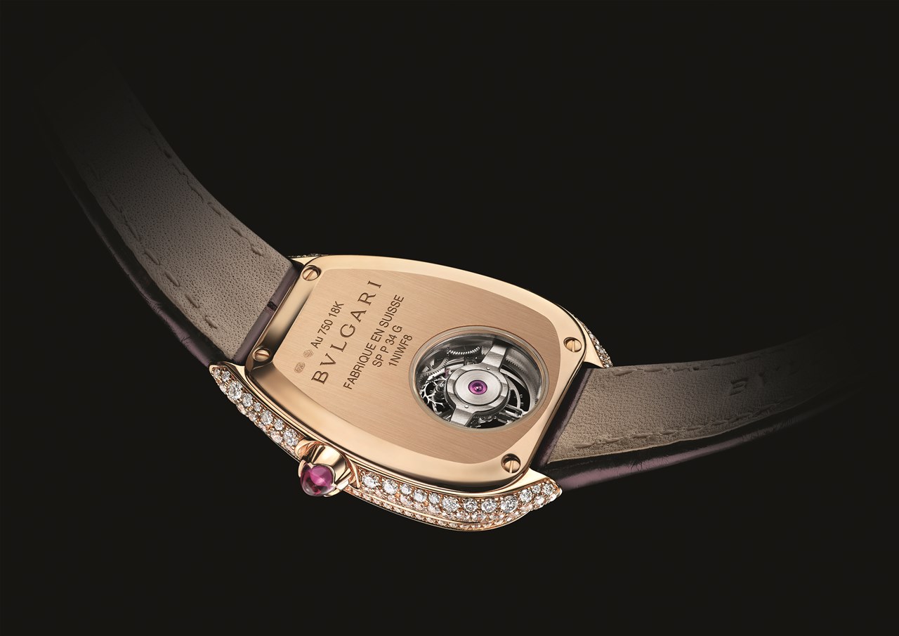 Этот узел является важной частью мануфактурного калибра BVL150 (размеры — 22 х 18 мм, высота — 3.65 мм, 23 камня, частота баланса — 21’600 пк/ч, запас хода — 40 часов) с ручным заводом и элегантной фасонной формой, специально созданной под корпус Serpenti Seddutori.