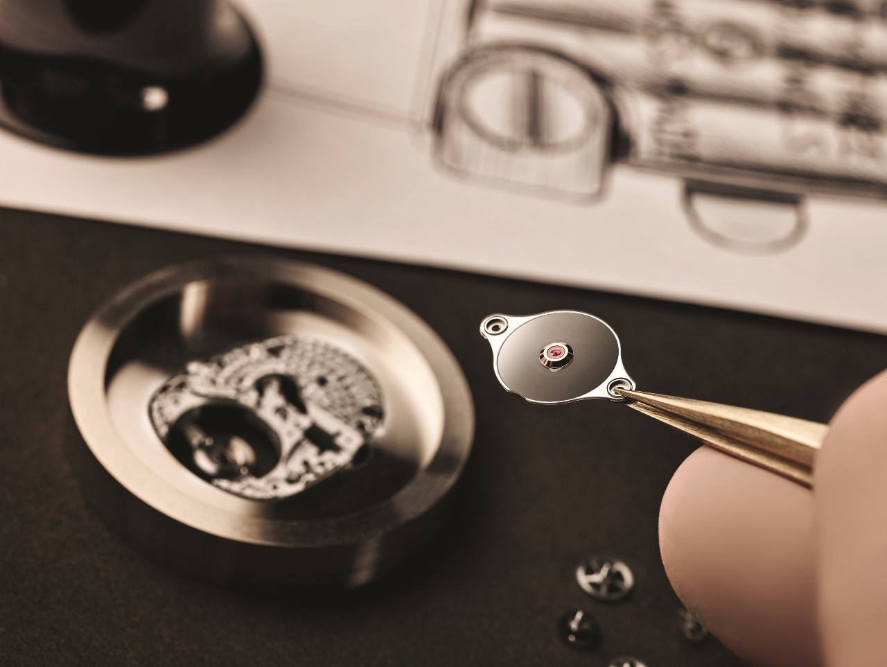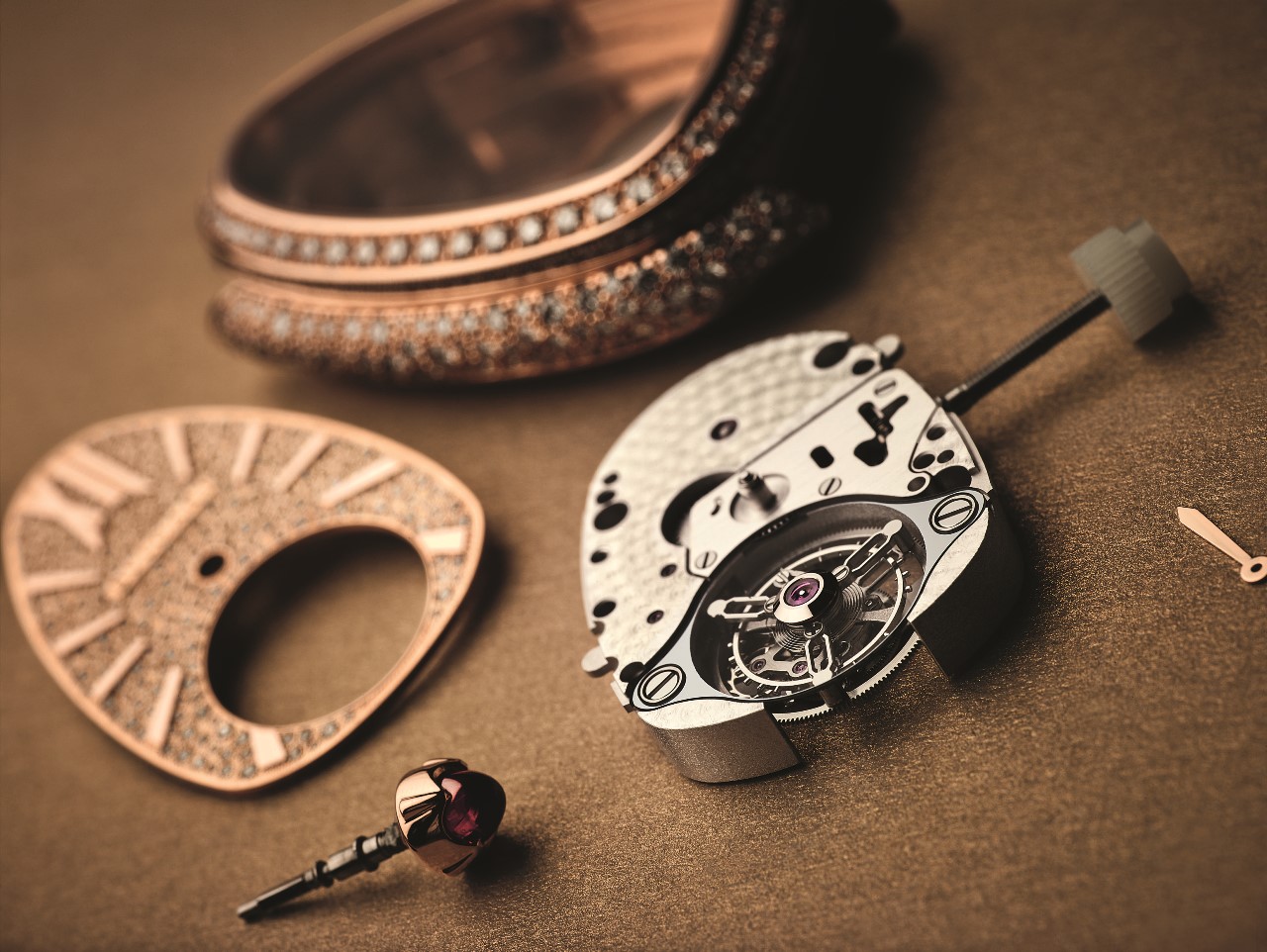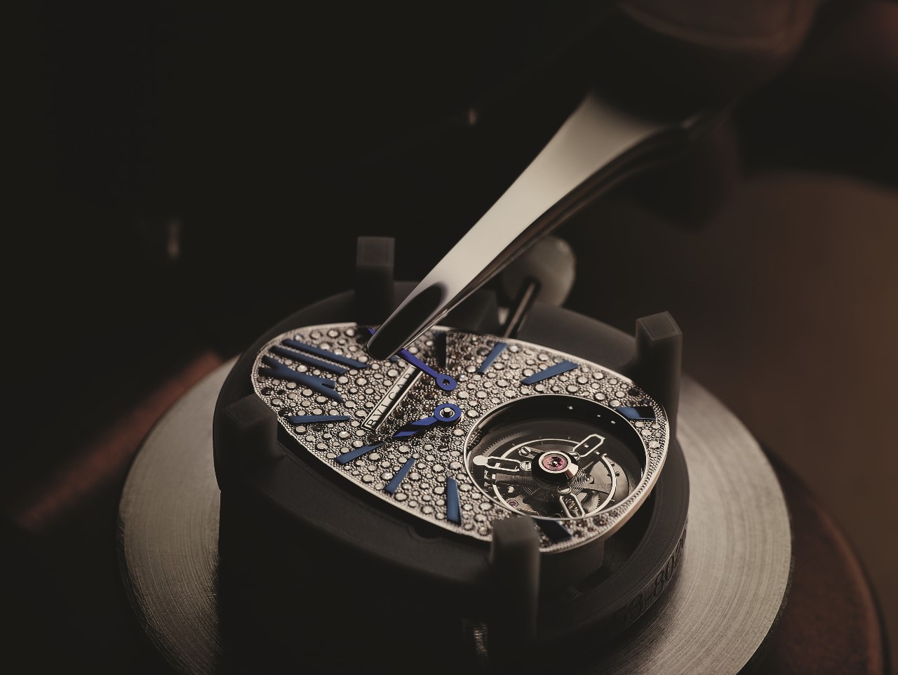 Механизм характеризуется высоким процентом ручной финишной отделки и декорирования, чуть повернутым валом заводной коронки для удобства манипуляции последней, а также верхним мостом турбийона, оснащенным сапфировым диском для лучшего обзора этого миниатюрного устройства.