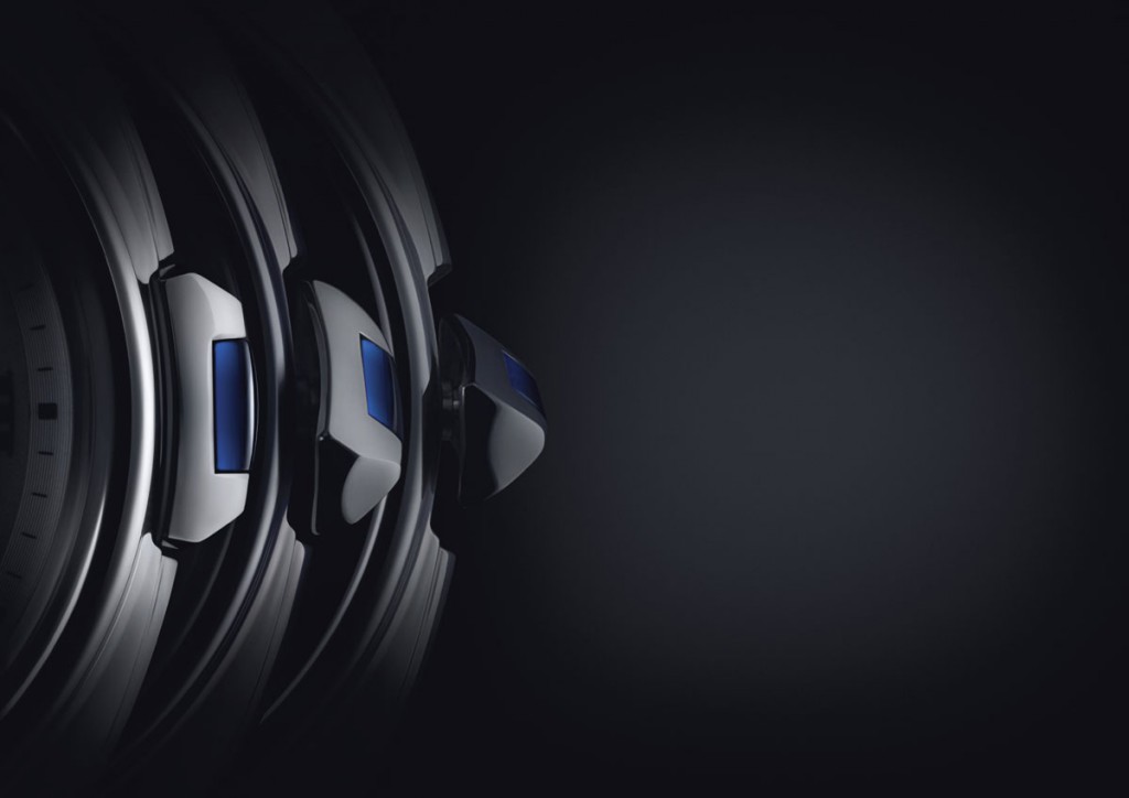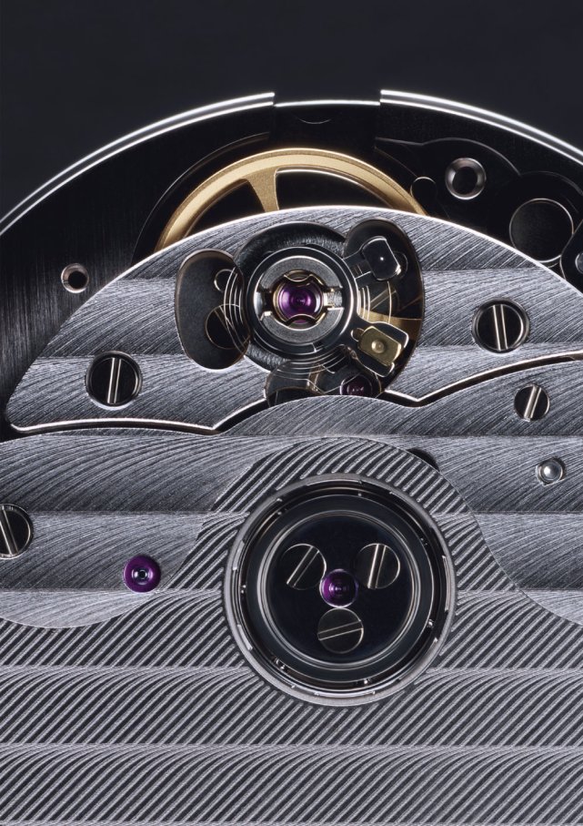Поверхность мостов и ротора автоподзавода, наблюдать за которыми позволяет сапфировое окно задней крышки корпуса, декорирована полосчатой фактурной шлифовкой Vagues de Genève.