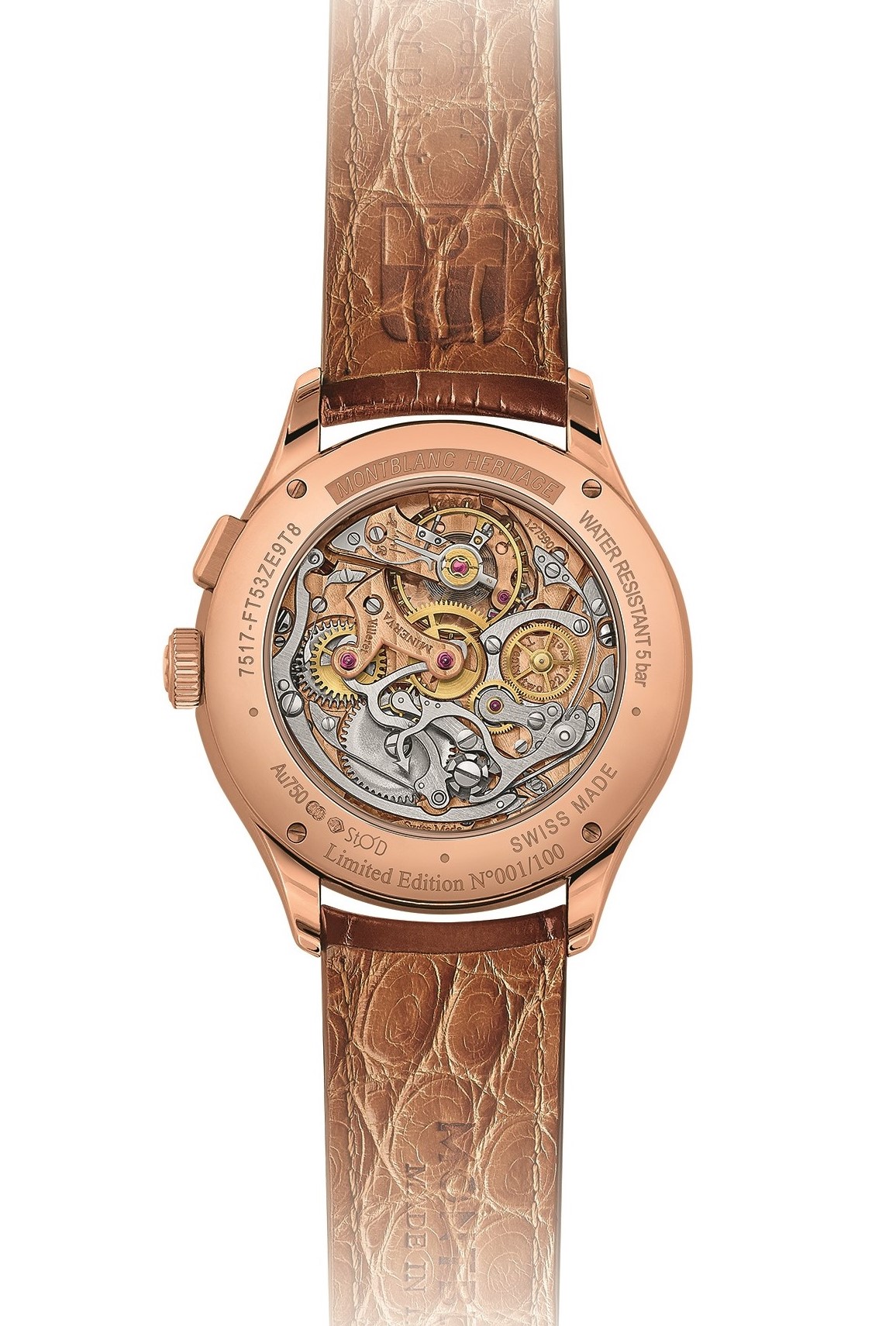 Сапфировое стекло задней крышке корпуса позволяет разглядеть искусную ручную отделку, использованную в оформлении нейзильберовых платины и мостов мануфактурного калибра Minerva MB M13.21 с ручным заводом и 55-часовым запасом хода — однокнопочного хронографа с колонным колесом и горизонтальным зацеплением.
