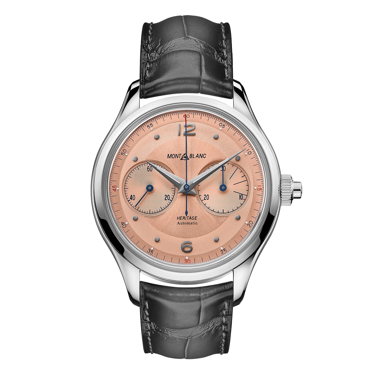 В свою очередь другая новинка — Heritage Monopusher Chronograph — обладающая стальным корпусом диаметром 42 мм и толщиной 14.7 мм, получила выпуклый циферблат лососевого цвета с арабскими цифрами и часовыми метками в виде точек с родиевым покрытием черного цвета.