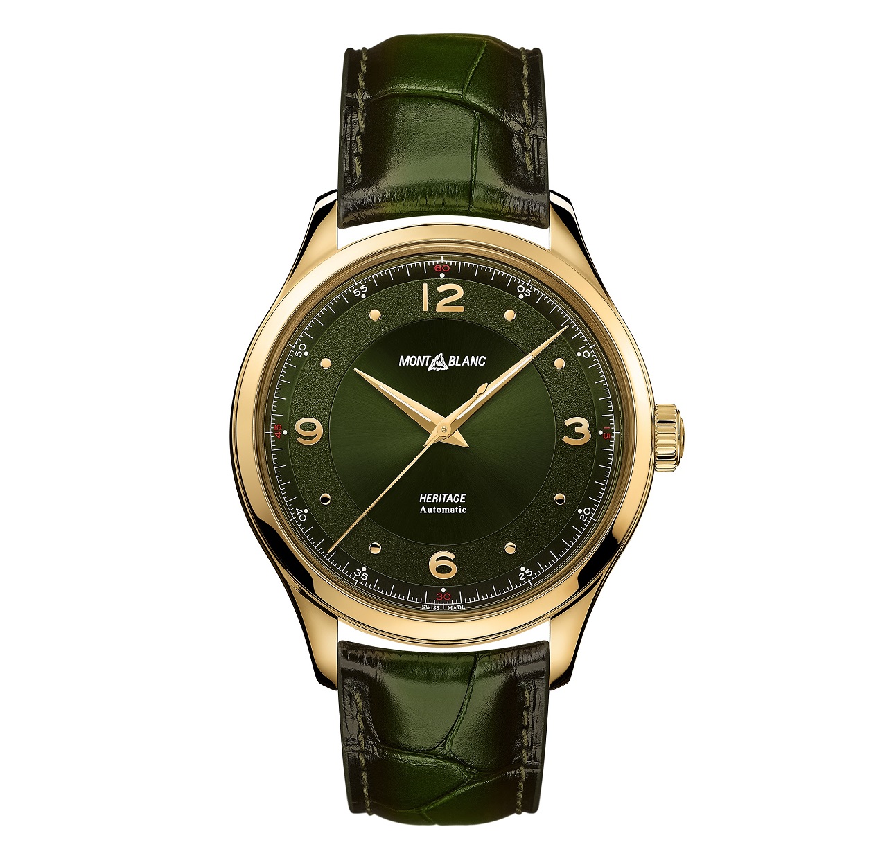 Наиболее простые из трех — часы Heritage Automatic — представлены в 40-миллиметровом корпусе толщиной 11 мм из 18-каратного желтого золота с совершенно новым типом циферблата темно-зеленого оттенка (British Racing Green), с лаковым покрытием и подходящим по тону ремешком из кожи аллигатора.