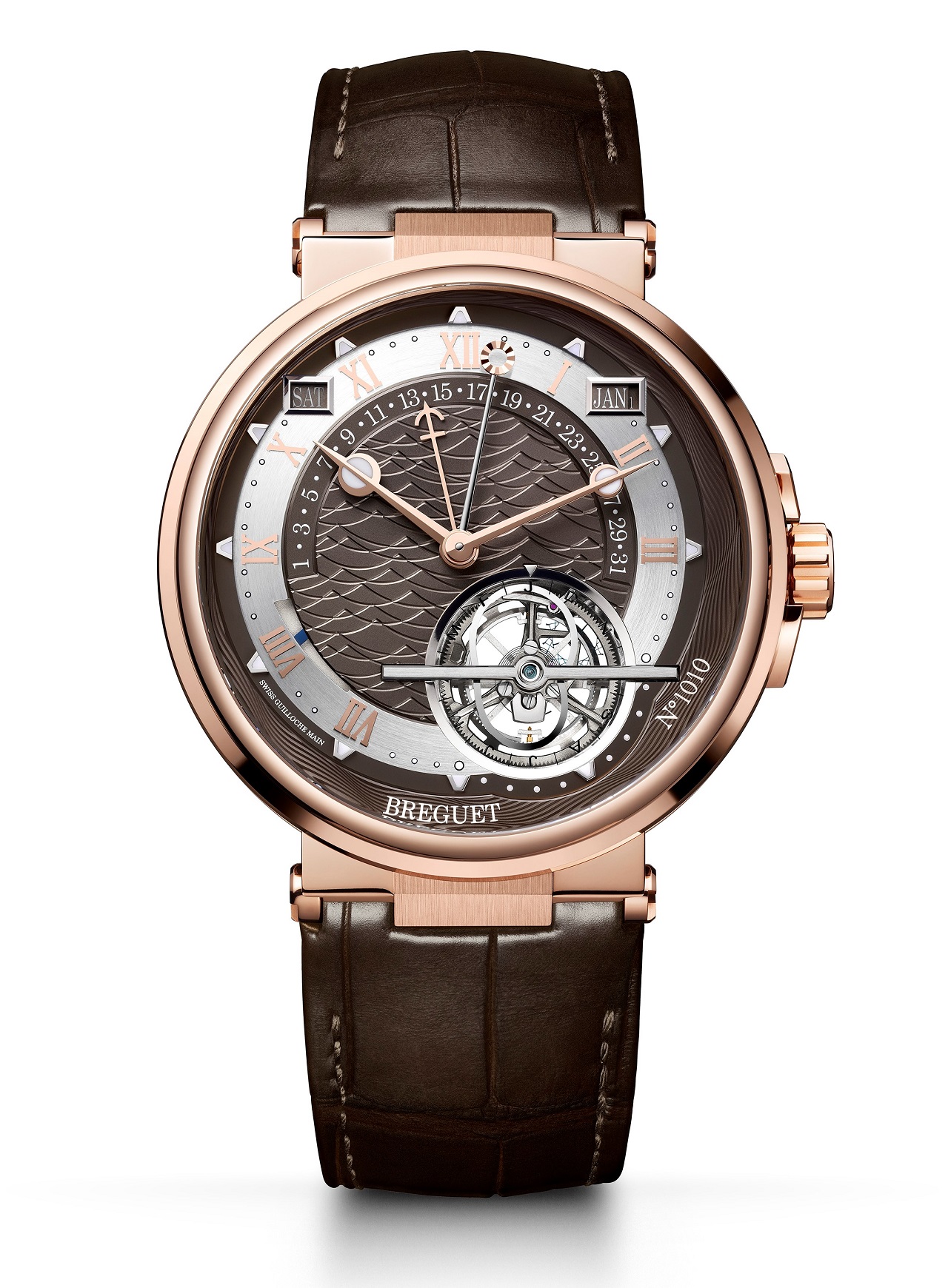 Часы Marine Équation Marchante 5887 поставляются на коричневом ремне из кожи аллигатора в сочетании с раскладывающейся застежкой из розового золота.