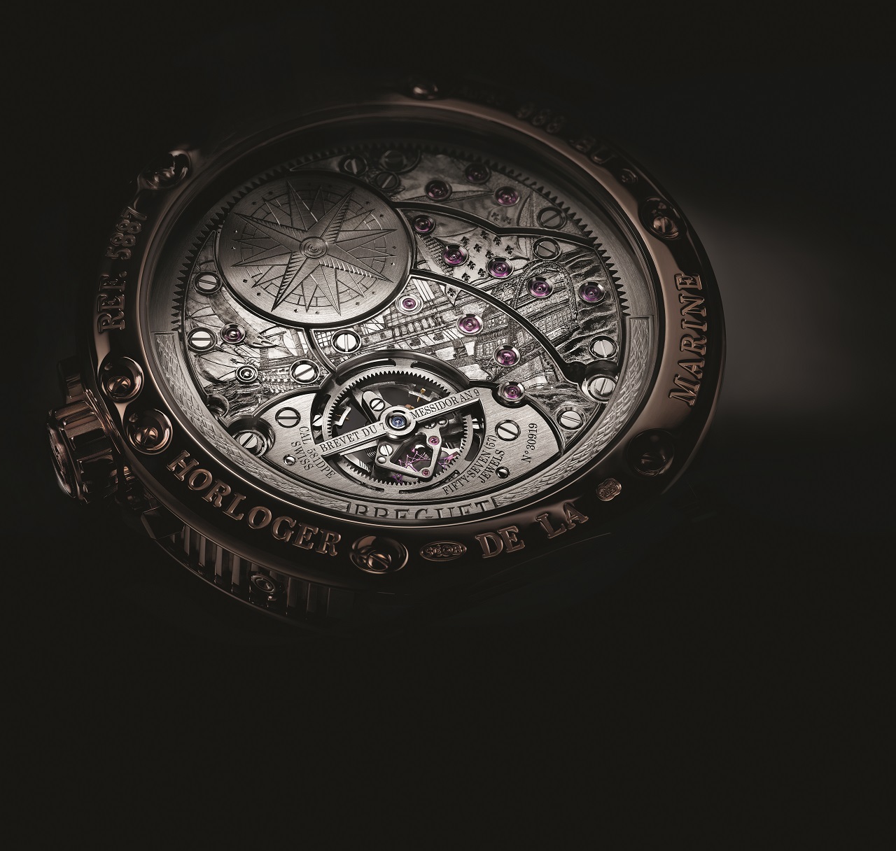 Отметим шикарное исполнение оборотной стороны механизма, благодаря периферийному ротору автоподзавода предстающей во всей красе — с вручную гравированными мостами (использовано изображение парусного линейного корабля Royal Louis Королевского флота Франции) и крышкой заводного барабана, декорированного розой ветров.