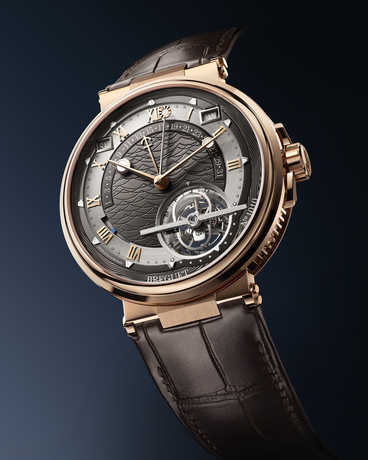Спустя три года после значимой базельской премьеры флагмана коллекции Marine, наделенного турбийном, вечным календарем и индикатором бегущего уравнения времени, знаменитая швейцарская марка демонстрирует версию в розовом золоте с циферблатом грифельно-серого цвета.