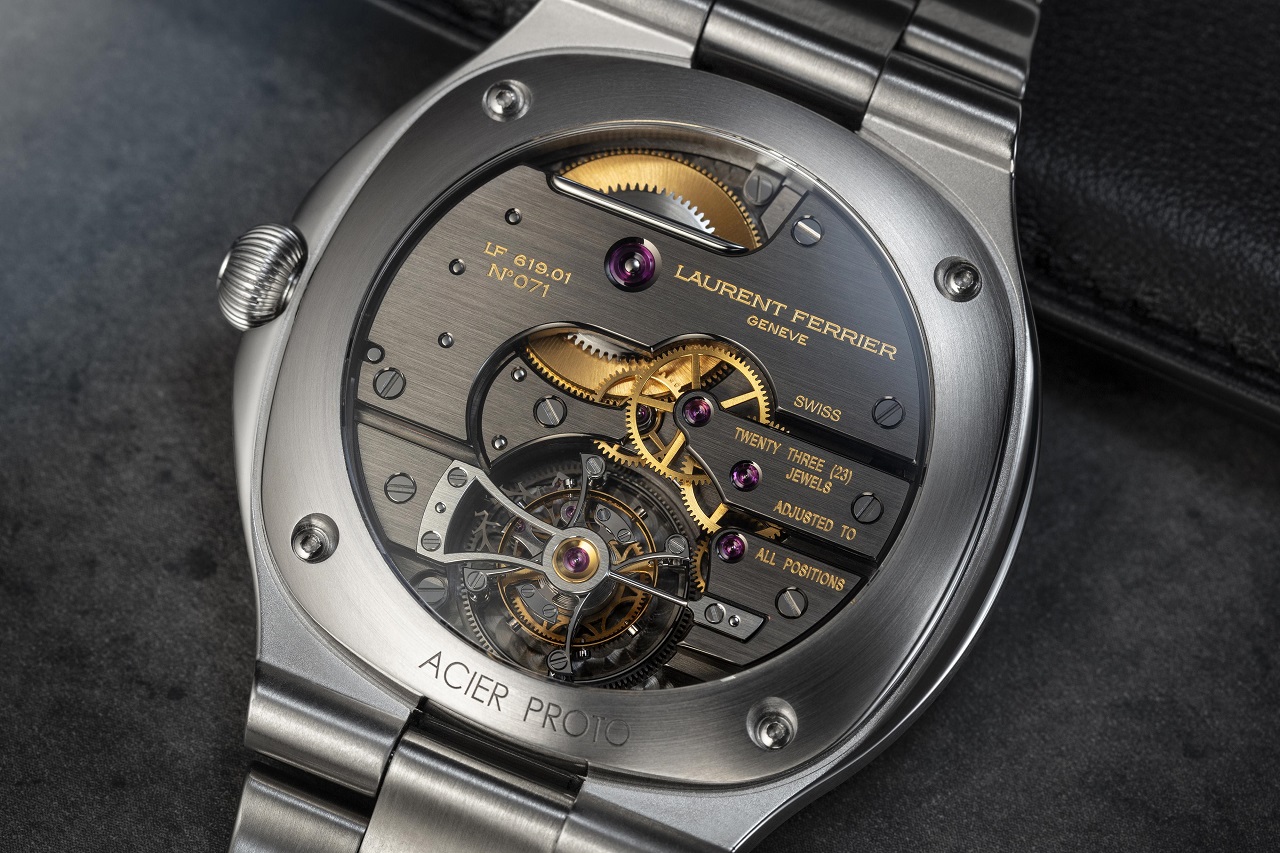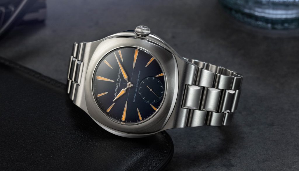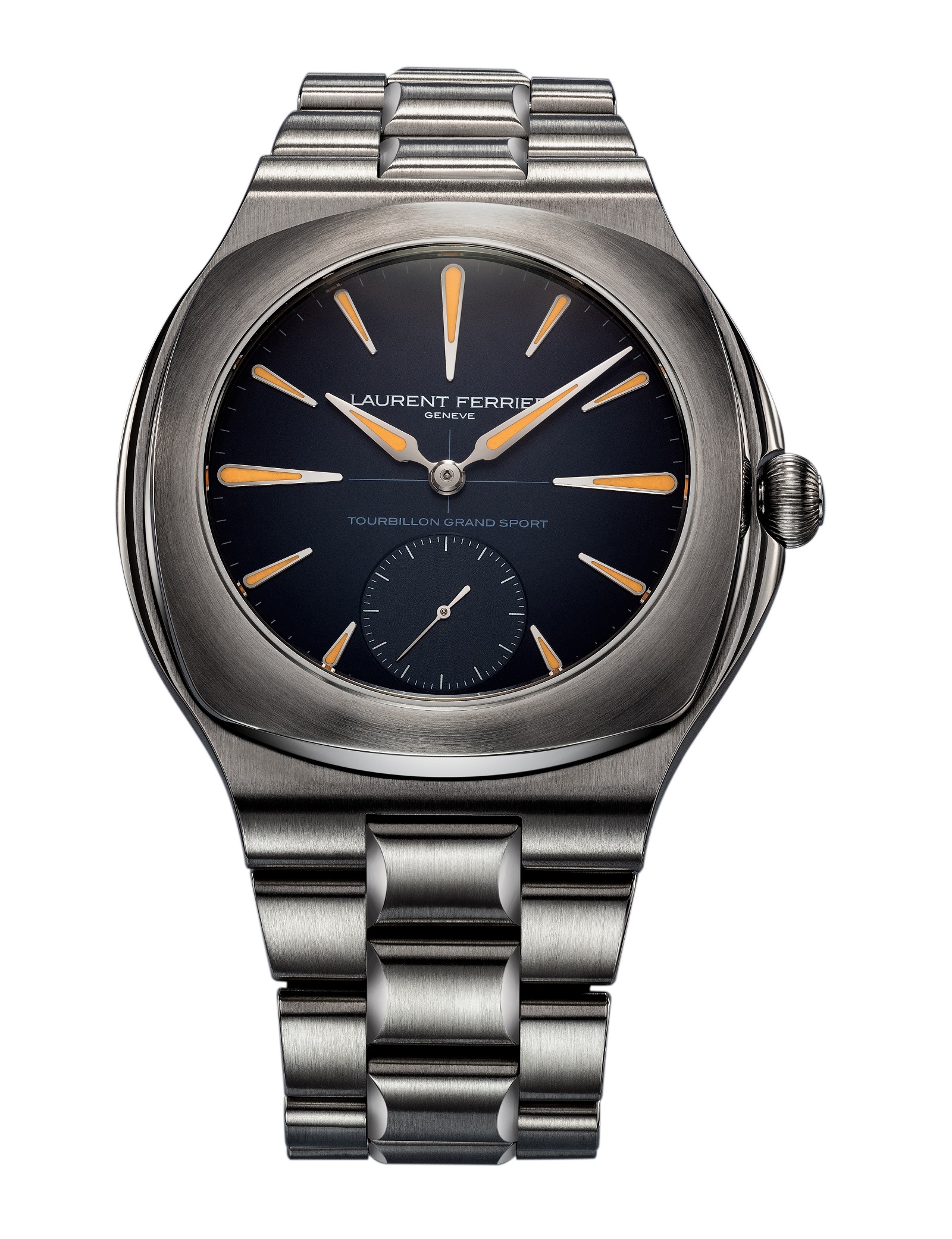 Стальной Grand Sport Tourbillon, вышедший из стен женевского ателье год назад и приуроченный к событиям 40-летней давности, когда молодые основатели бренда, Лоран Ферье и Франсуа Серванен, принимали участие в легендарной автогонке «24 часа Ле Мана» за рулем Porsche 935T, в 2020 году обзавелся массивным стальным браслетом с тремя рядами полукруглых звеньев.