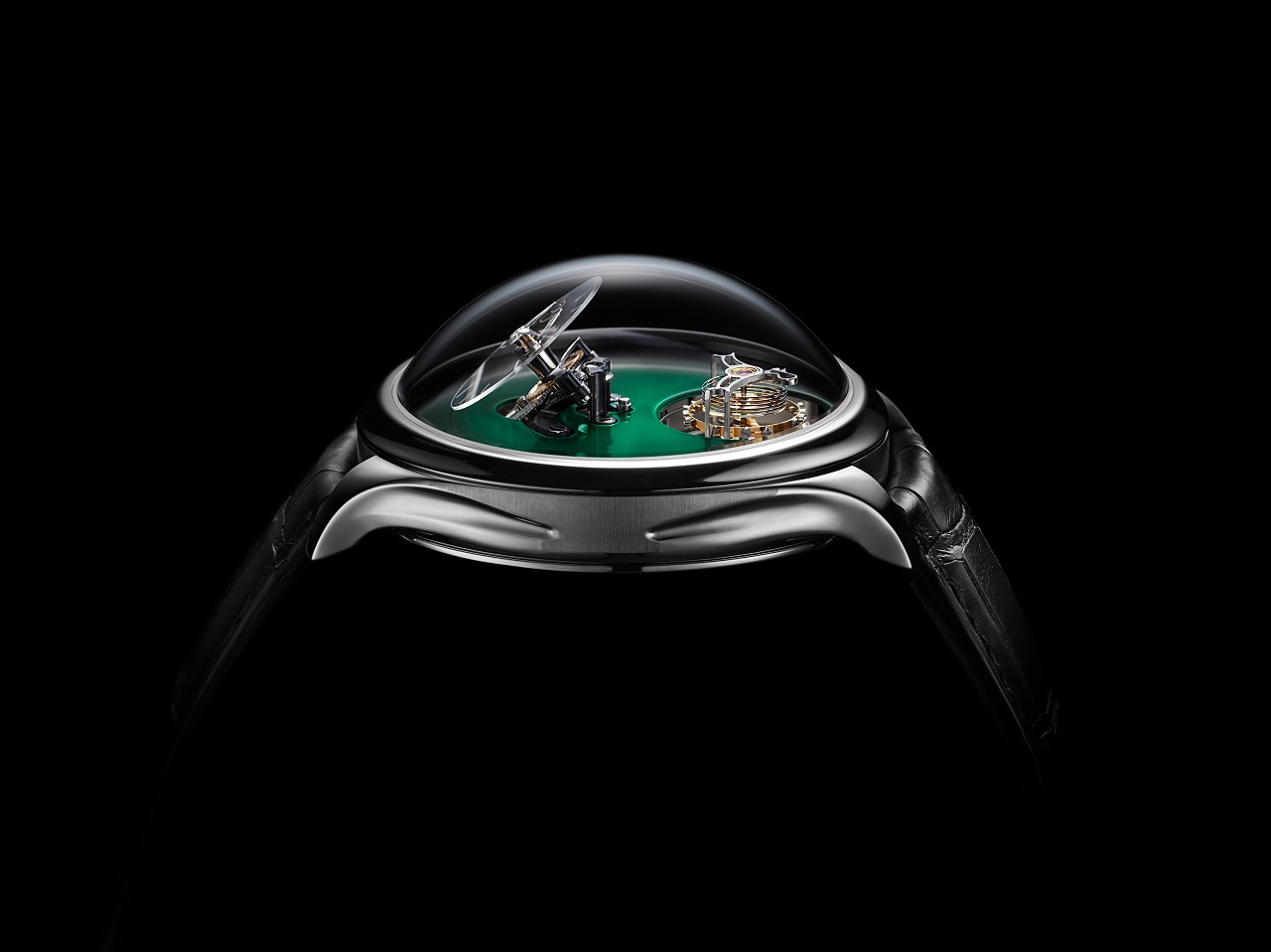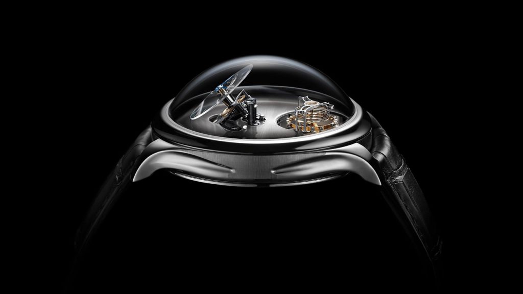 Все это великолепие заключено под высокий купол сапфирового стекла 42-миллиметрового стального корпуса толщиной 9.4 мм, при этом полная высота изделия в верхней точки прозрачной сферы достигает 19.5 мм.