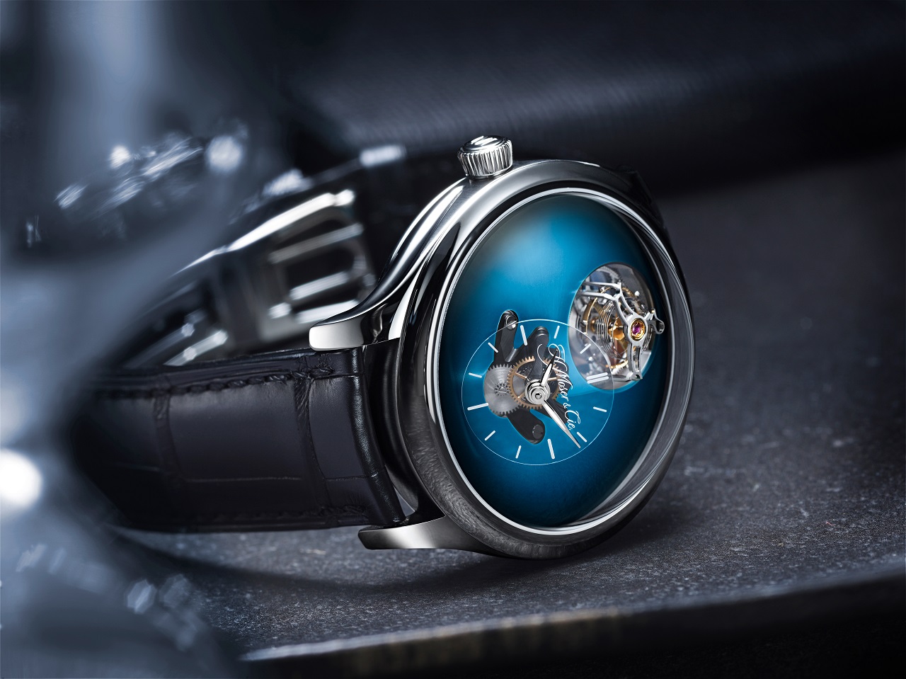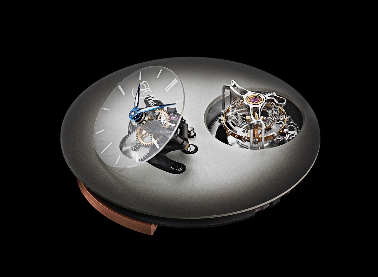Малый циферблат с двухстрелочной индикацией выполнен на основе сапфирового диска, смещенного к 6-часовой метке и установленного под углом в 40° к основной плоскости, а положение «12 часов» отдано на откуп «парящему» минутному турбийону, возвышающемуся над циферблатом и оснащенному цилиндрической спиралью баланса производства дочерней фабрики Precision Engineering AG.