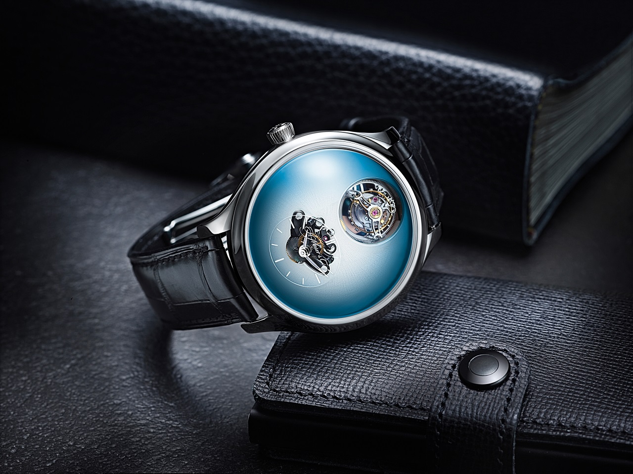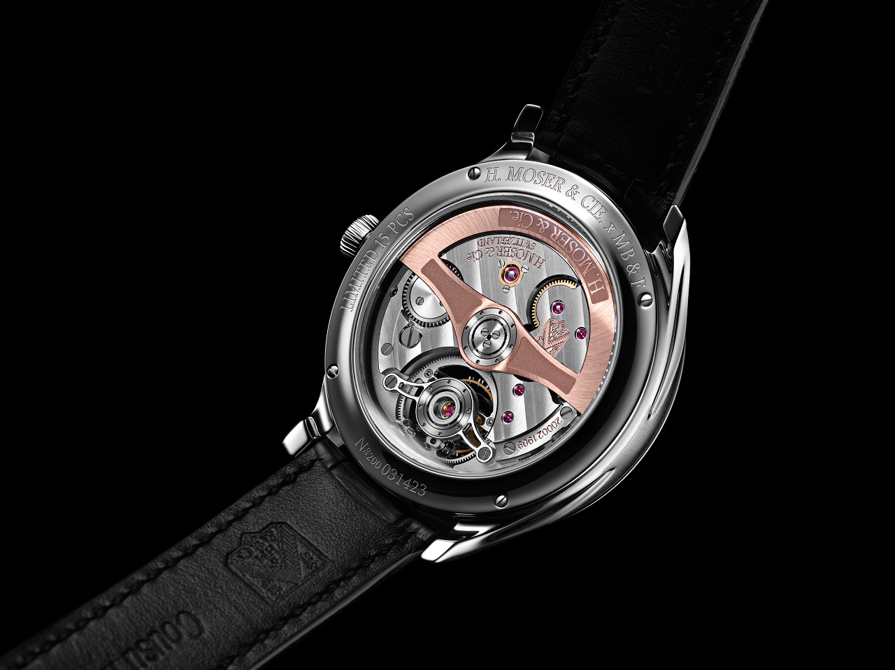 Спутником каждой версии Endeavour Cylindrical Tourbillon H. Moser x MB&F является прошитый вручную ремешок из кожи аллигатора, черного цвета, поставляемый вместе с раскладывающейся стальной застежкой.
