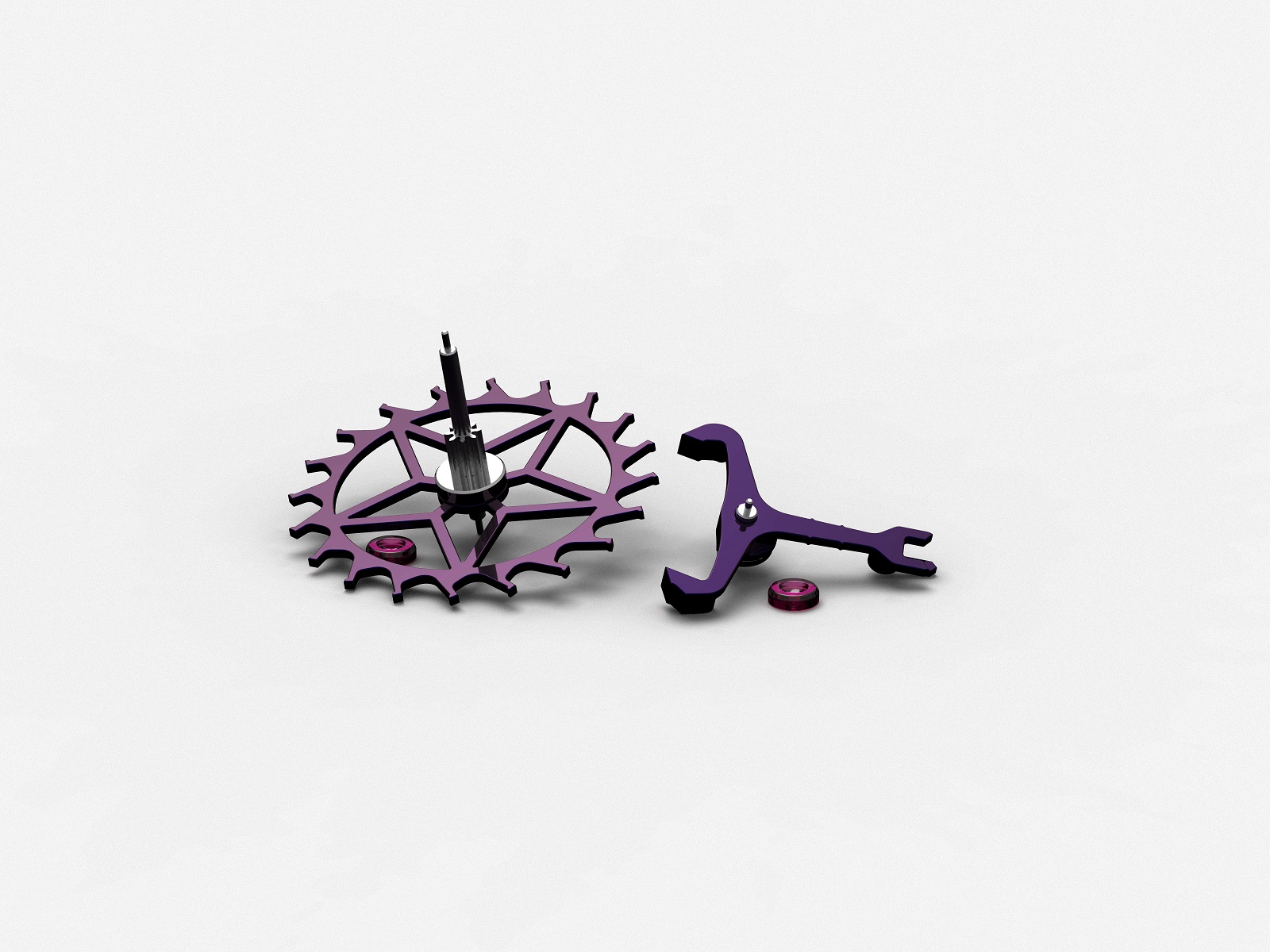 Только в этой модели цвет кремниевых деталей спускового механизма успешно гармонирует с общим цветовым решением часов, фиолетовый цвет которого выбран маркетологами компании не случайно — имея наиболее высокую частоту воспринимаемых человеческим глазом световых колебаний, он идейно как никто другой близок к высокочастотной концепции построения механических хронографов Zenith.