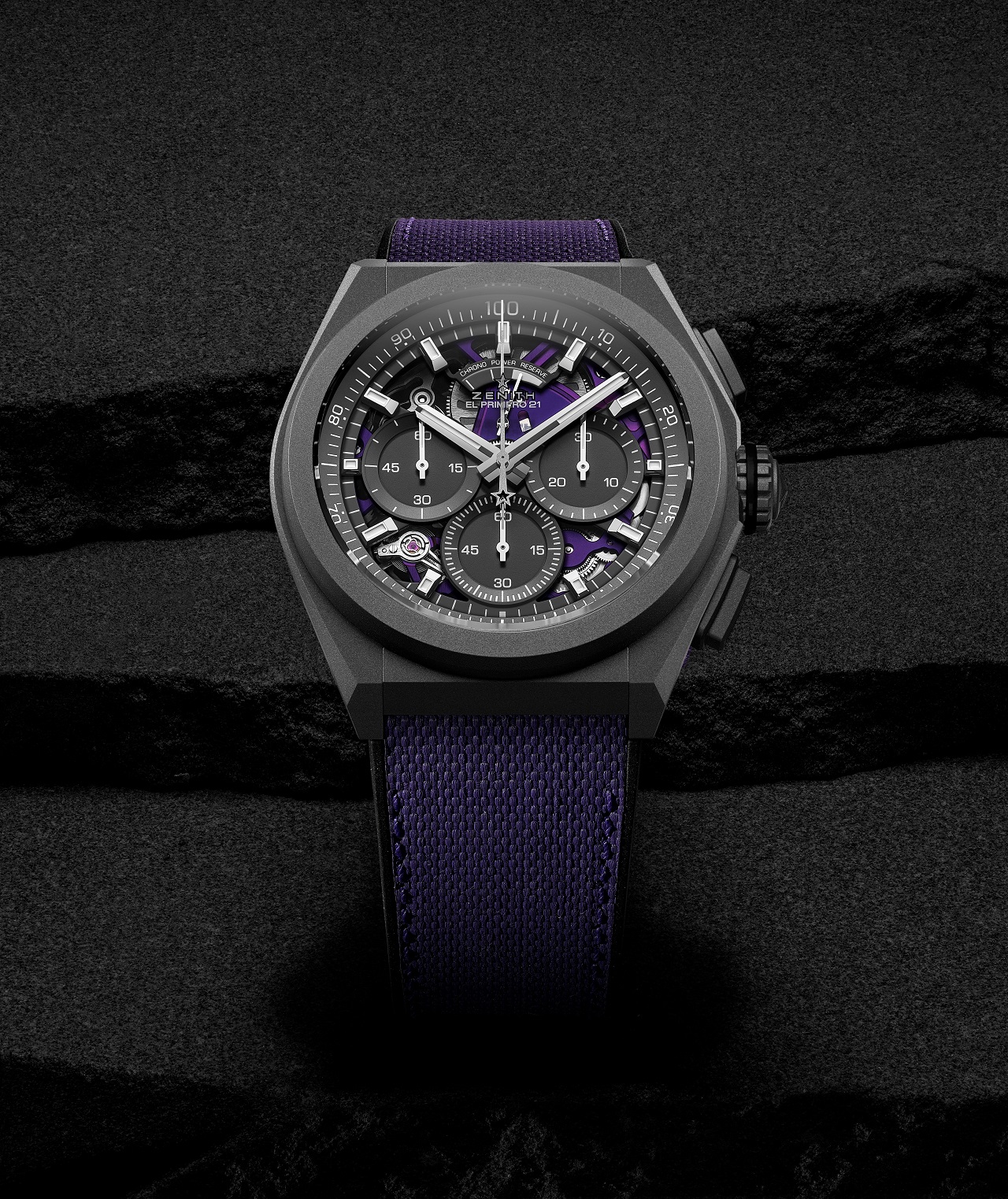 Ныне в обертку из 44-миллиметрового титанового корпуса с микродробеструйной отделкой (WR 100 м) заключен скелетонизированный калибр, платина, мосты и ротор автоподзавода которого используют покрытие фиолетового оттенка по аналогии с синим цветом Zenith Blue прошлогодней бутиковой лимитки.