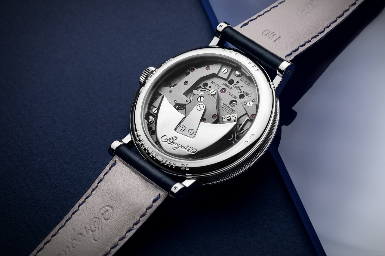 Модель Tradition 7097 воспроизводит красоту механизмов подписных и тактильных часов Breguet, выставляя на обозрение мосты, колеса, спусковой механизм, заводной барабан и другие детали, которые обычно расположены под платиной: симметрично расположенные мосты создают визуальный баланс и отличаются тонкой отделкой — их поверхности декорированы посредством особой технологии, обеспечивающей равномерную зернистую структуру.