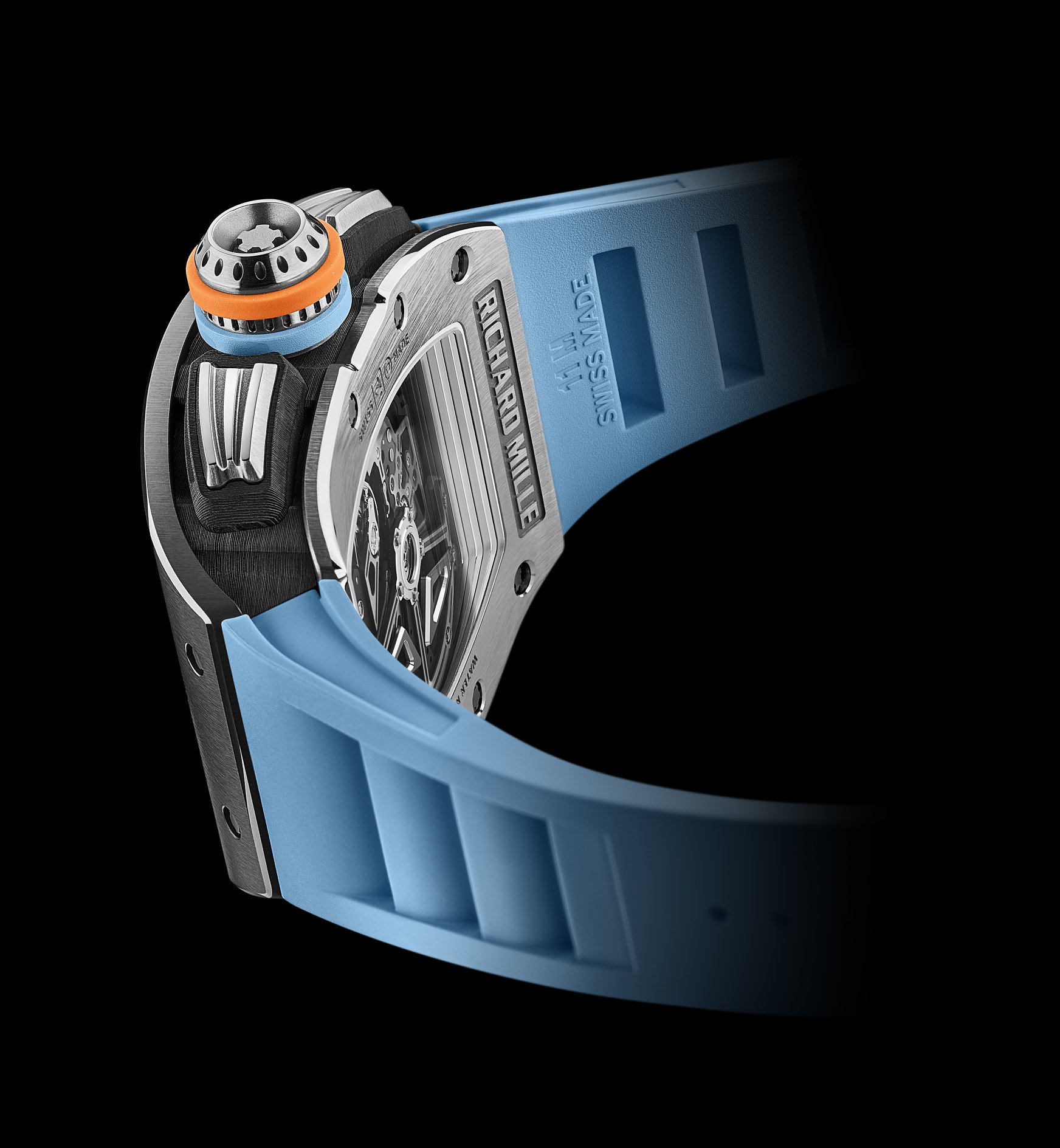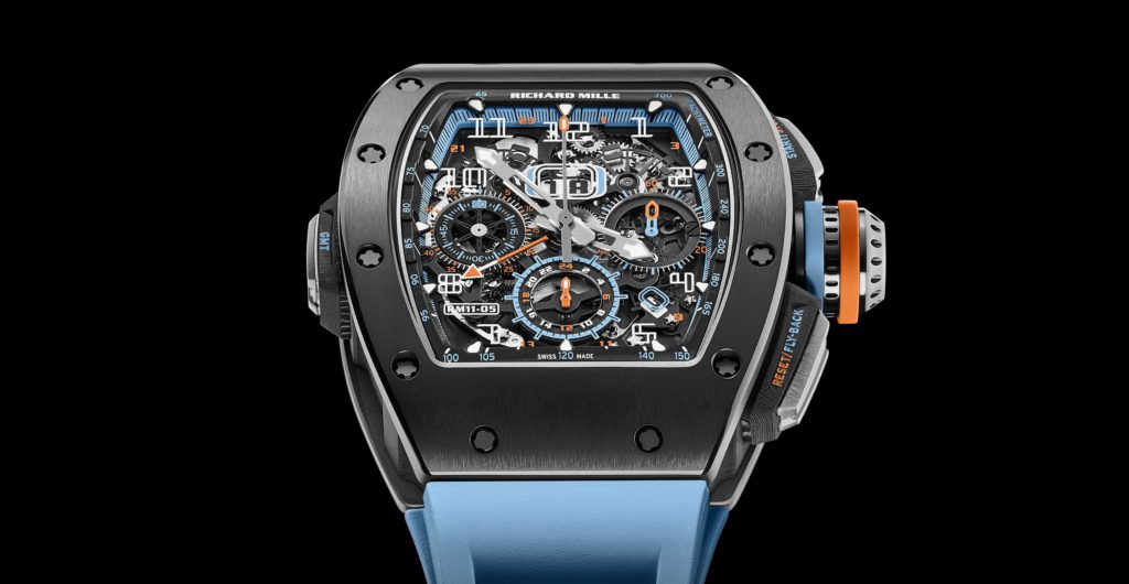 В комплектацию RM 11-05 Automatic Winding Flyback Chronograph GMT, что являются частью ограниченной серии из 140 экземпляров стоимостью около 200 тысяч швейцарских франков каждый, входит каучуковый ремешок спортивного стиля, окрашенный в голубой цвет.