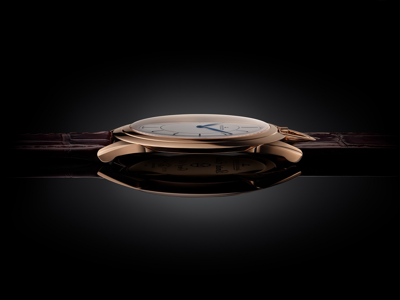 В связи с чем новинка характеризуется широким ступенчатым безелем и верхним расположением заводной коронки с треугольной скобой, а секторный циферблат с листьевидными воронеными стрелками создан в предельно лаконичной манере — с элегантной часовой разметкой и минутной шкалой стиля «железная дорога».