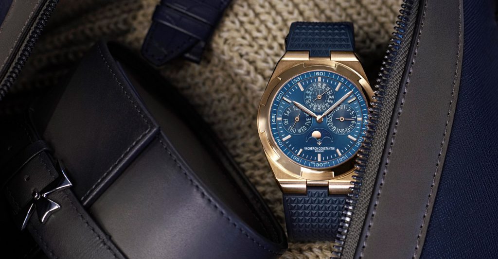 Ультратонкая модель с вечным календарем из коллекции Overseas женевской мануфактуры Vacheron Constantin получила в свое распоряжение циферблат синего цвета, что добавляет респектабельности и без того роскошному исполнению часов, корпус и браслет которых изготовлен из 18-каратного розового золота.