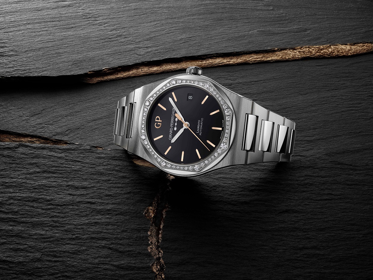 Характерный восьмиугольный безель линии Laureato в данном случае инкрустирован 56 бриллиантами классической огранки общим весом около 0.9 карат.