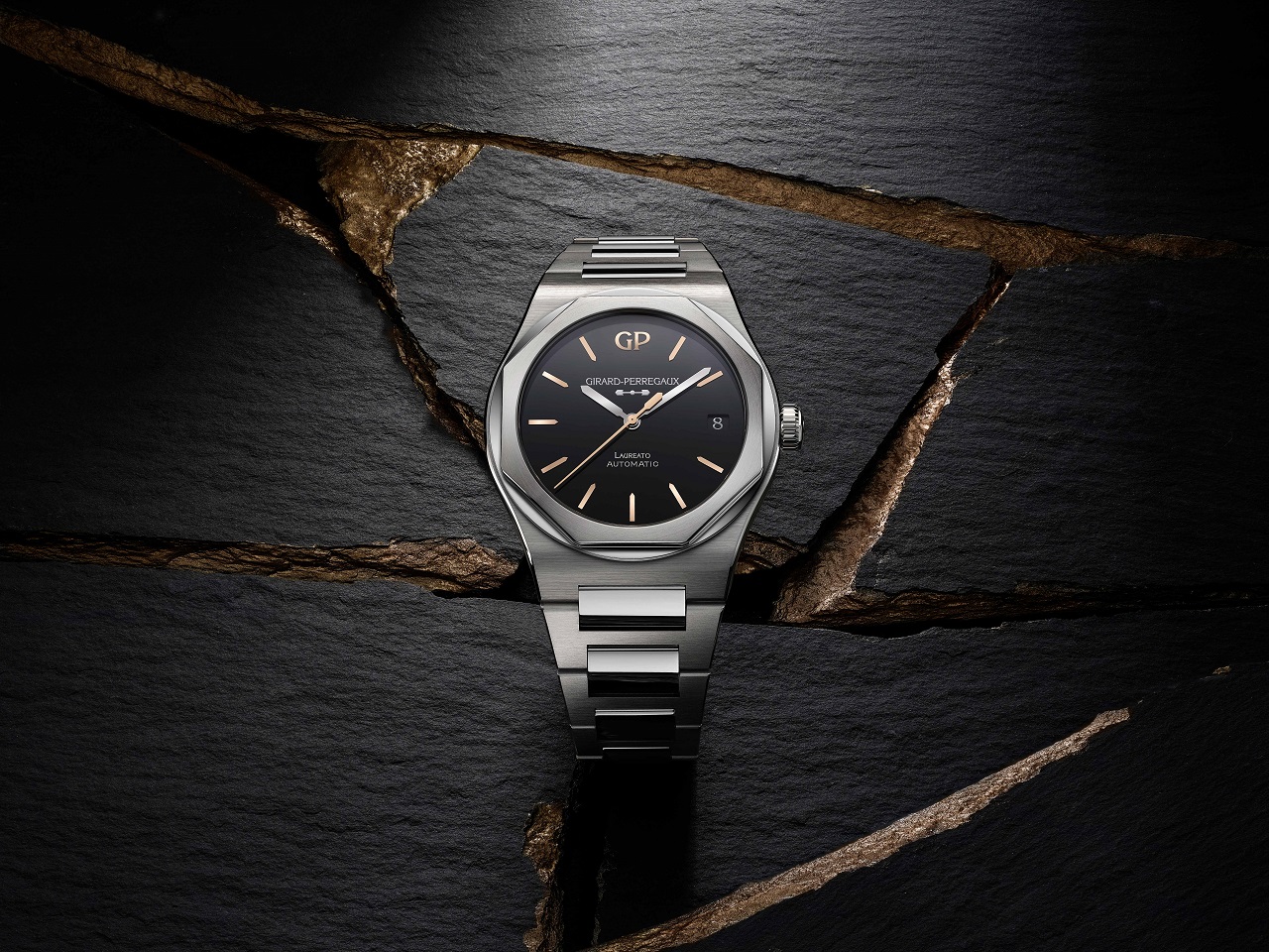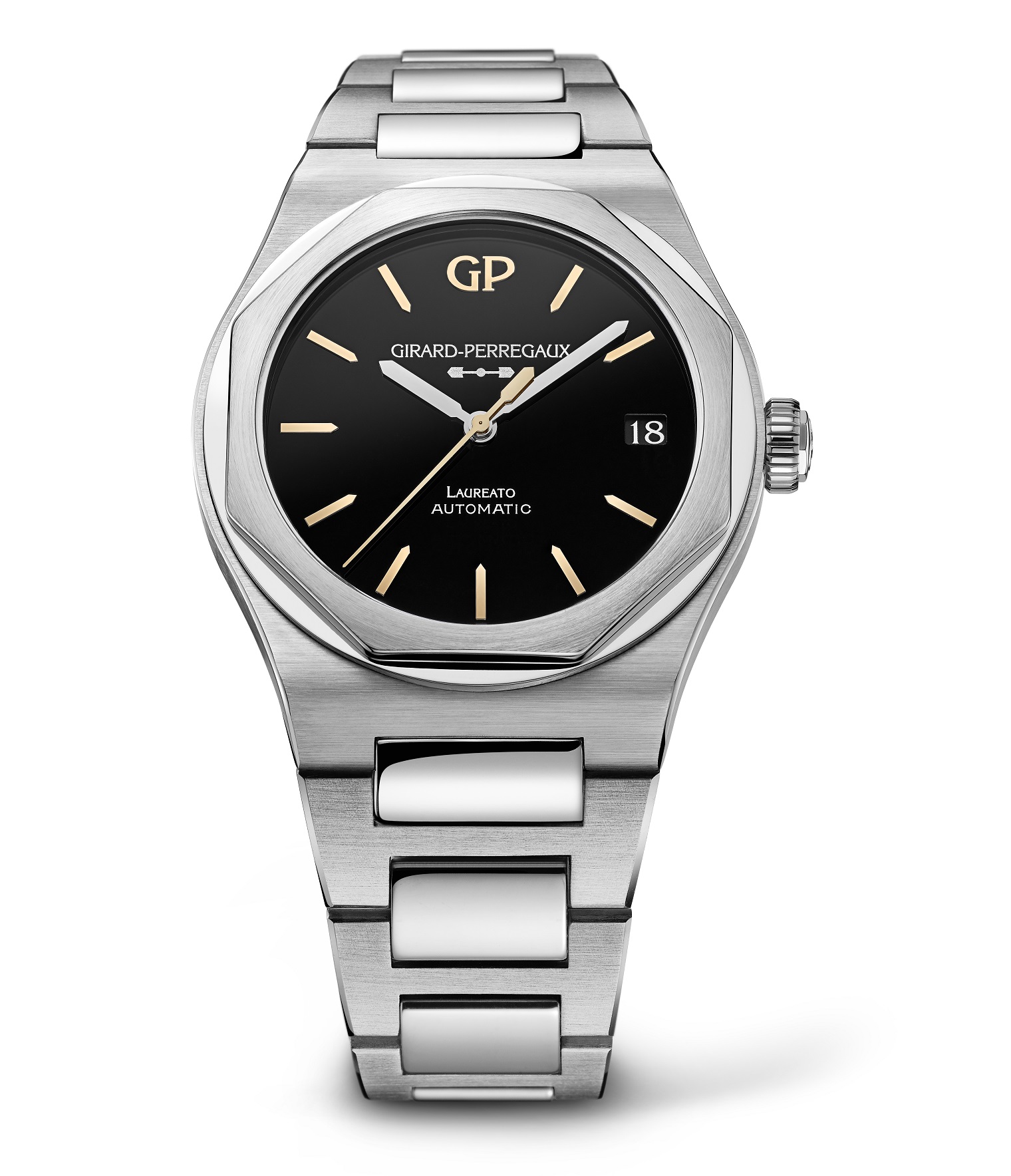 Младшая модель Laureato 38 Infinity Edition (тираж — 88 единиц) использует автоматический калибр GP03300-1409 с 4-герцовым балансом и 46-часовым запасом хода, разместившийся внутри стального корпуса диаметром 38 мм и толщиной 9.8 мм.