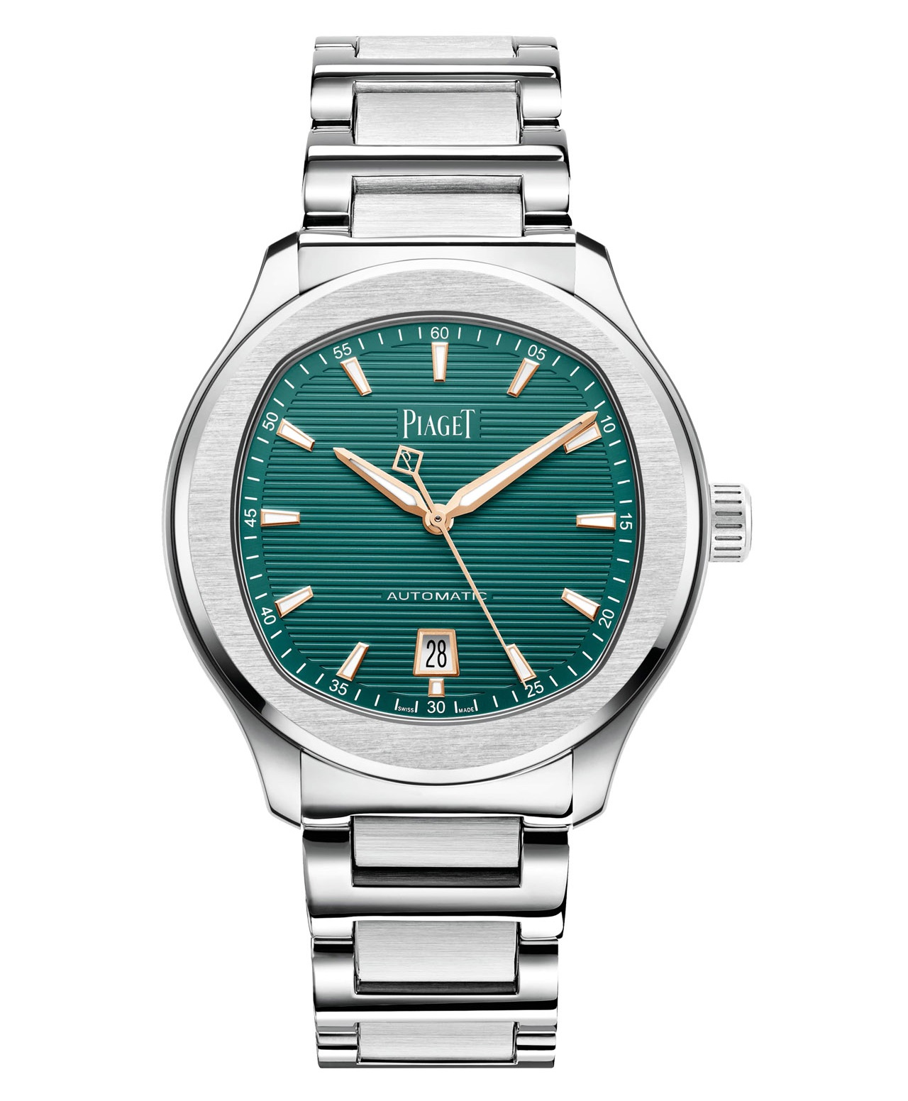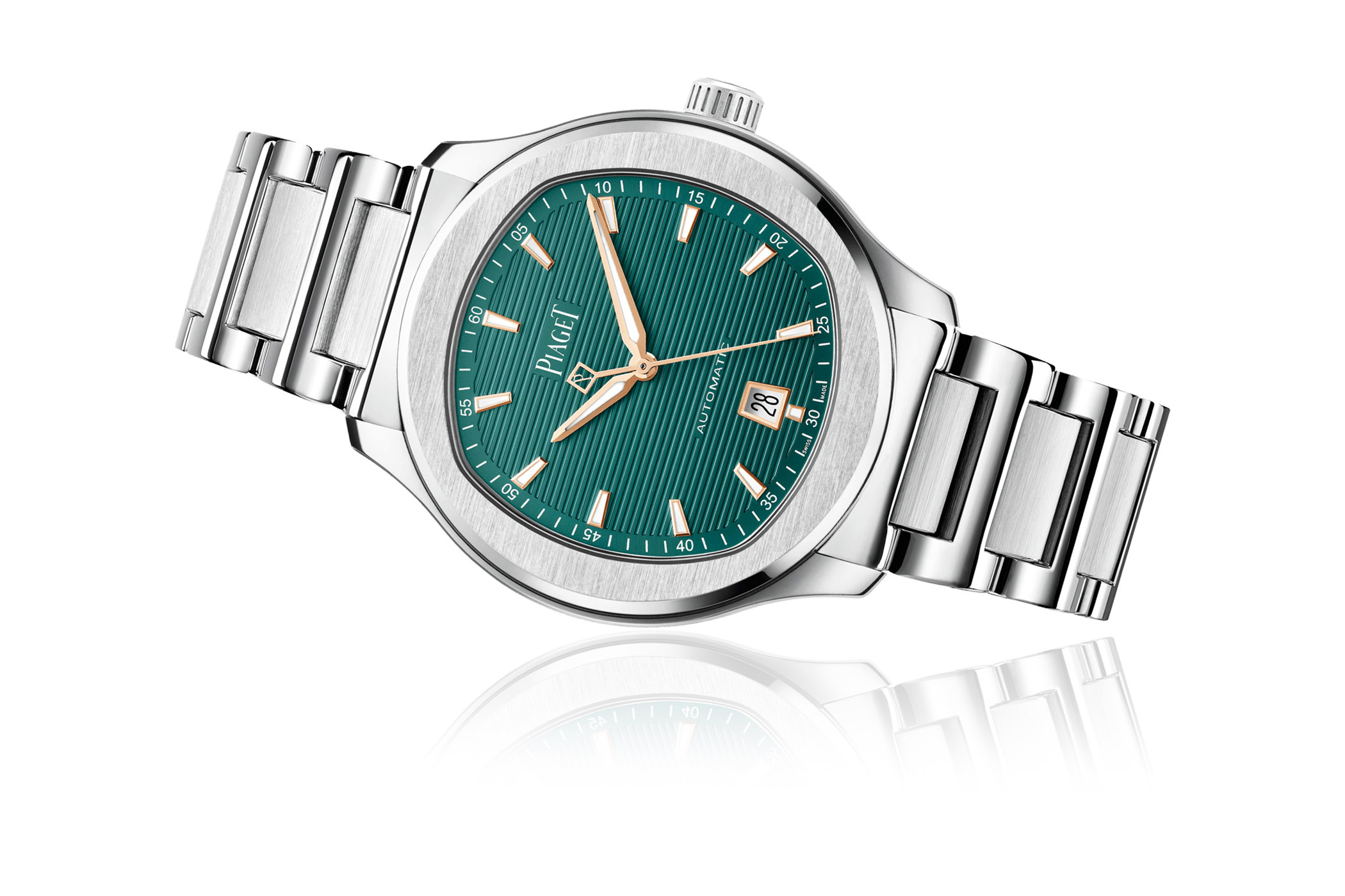 Его темно-зеленое гальванопокрытие подчеркивает горизонтальное гильоше, с которым выгодно взаимодействуют накладные элементы и указатели из розового золота, среди которых особенно деликатно выглядит противовес секундной стрелки в виде ромба с литерой «P».