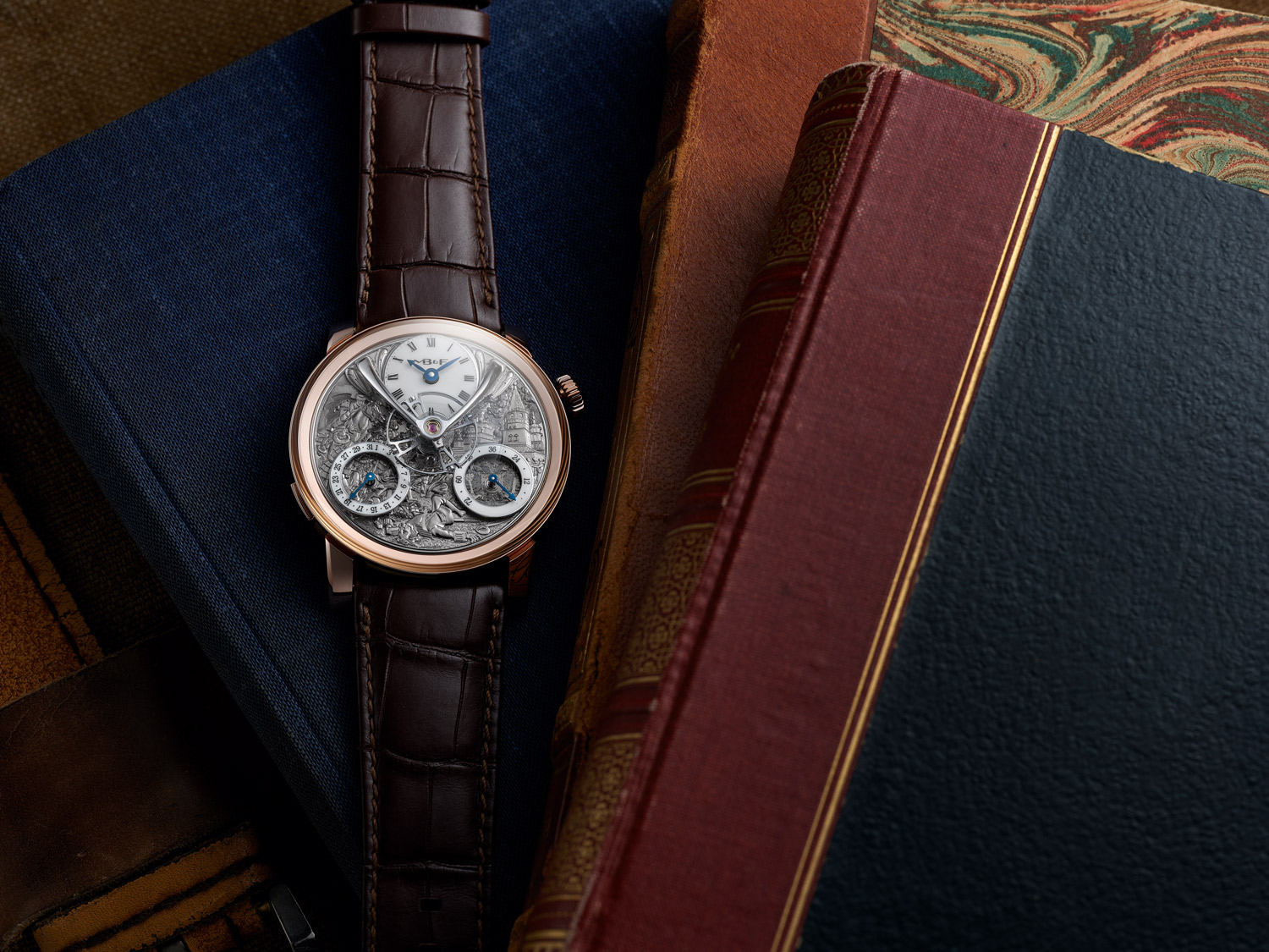 В заключение напомним, что часы, поставляемые на прошитом вручную темно-коричневом ремешке из кожи аллигатора, укомплектованы эксклюзивным калибром, разработанным для MB&F Стивеном МакДоннелом, с ручным заводом, 2.5-герцовым балансом, запасом хода в 72 часа и разнесенными по разные стороны часов спусковым механизмом и колебательной системой баланс-спираль.