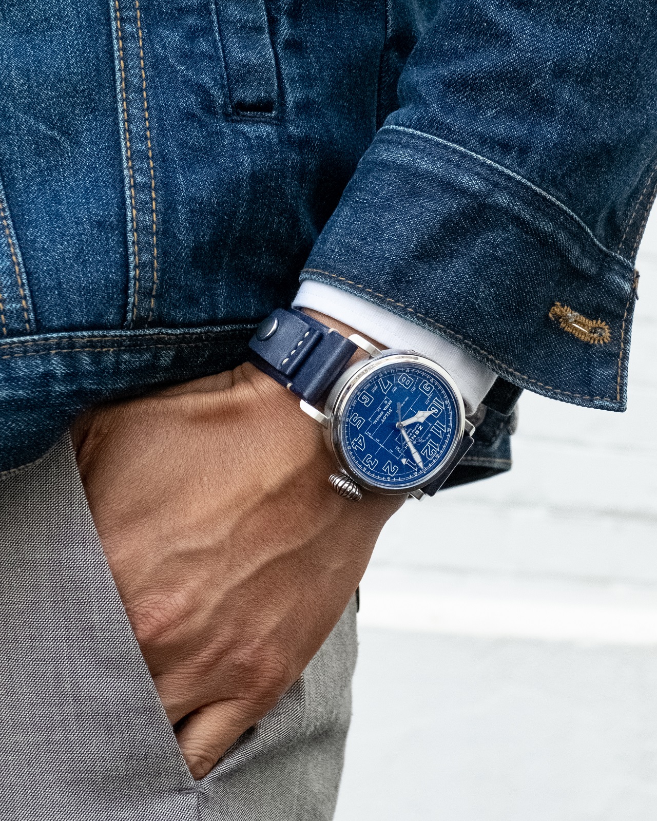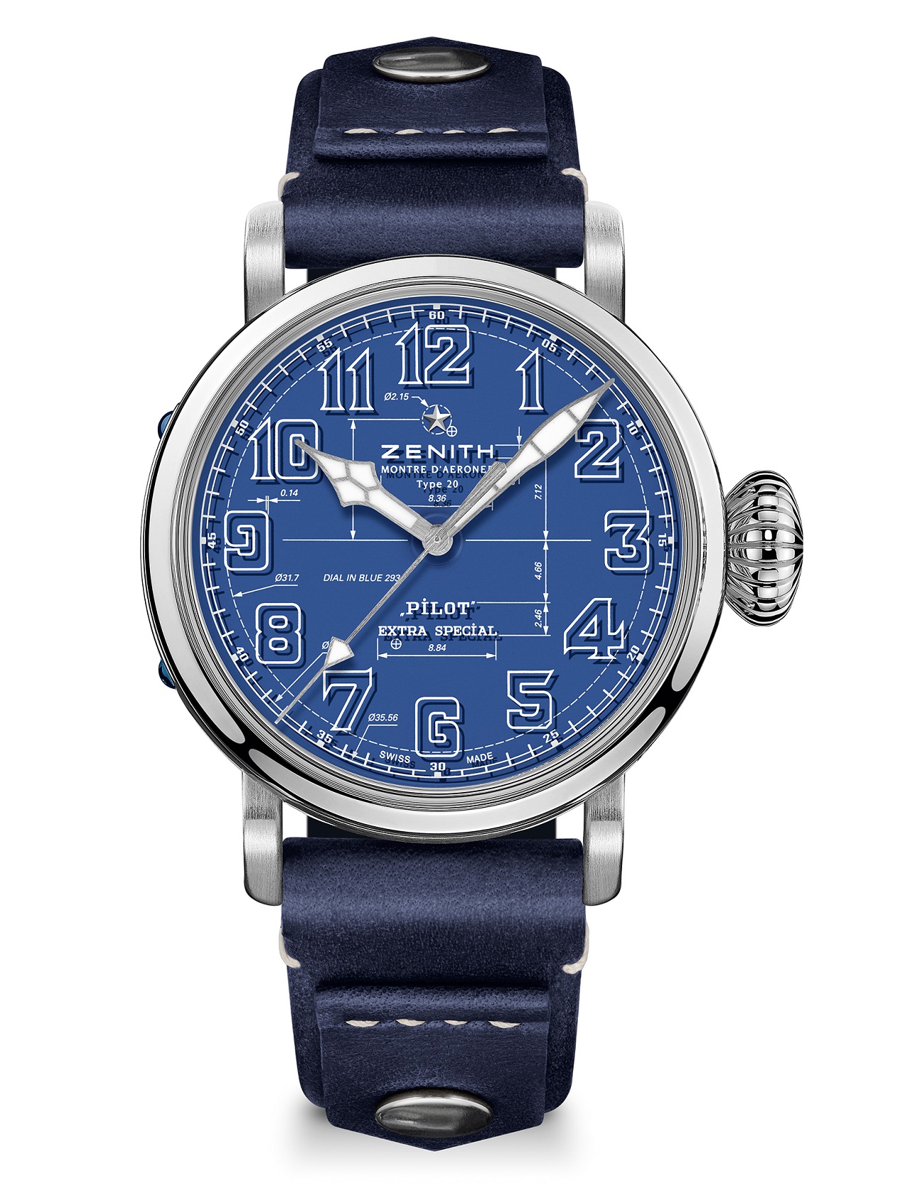 Часы крепятся на запястье синим ремнем из телячьей кожи, по текстуре напоминающей традиционные летные куртки из овчины, с заклепками и классической титановой застежкой, а также характерной нашивкой, наподобие тех, что раньше можно было увидеть на шлемах пилотов.