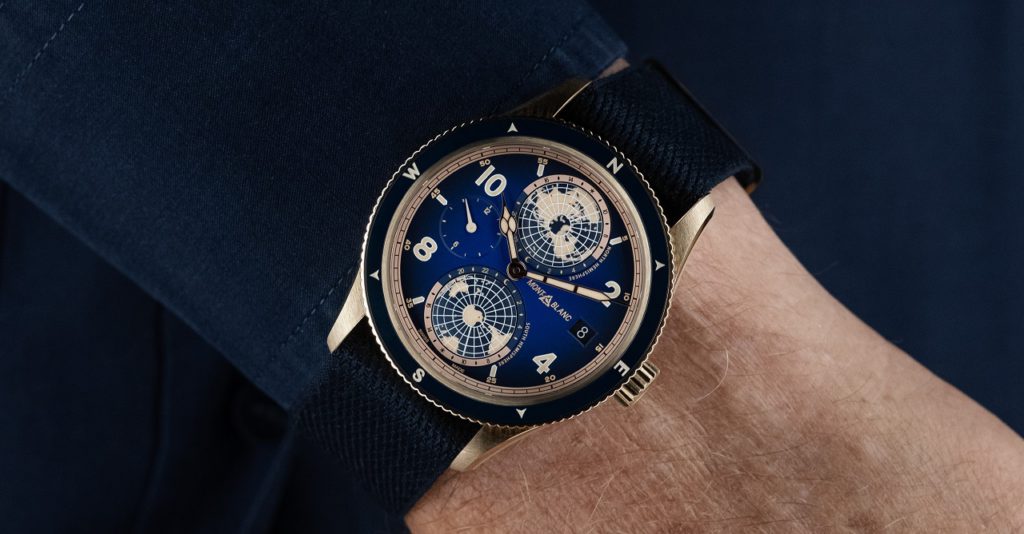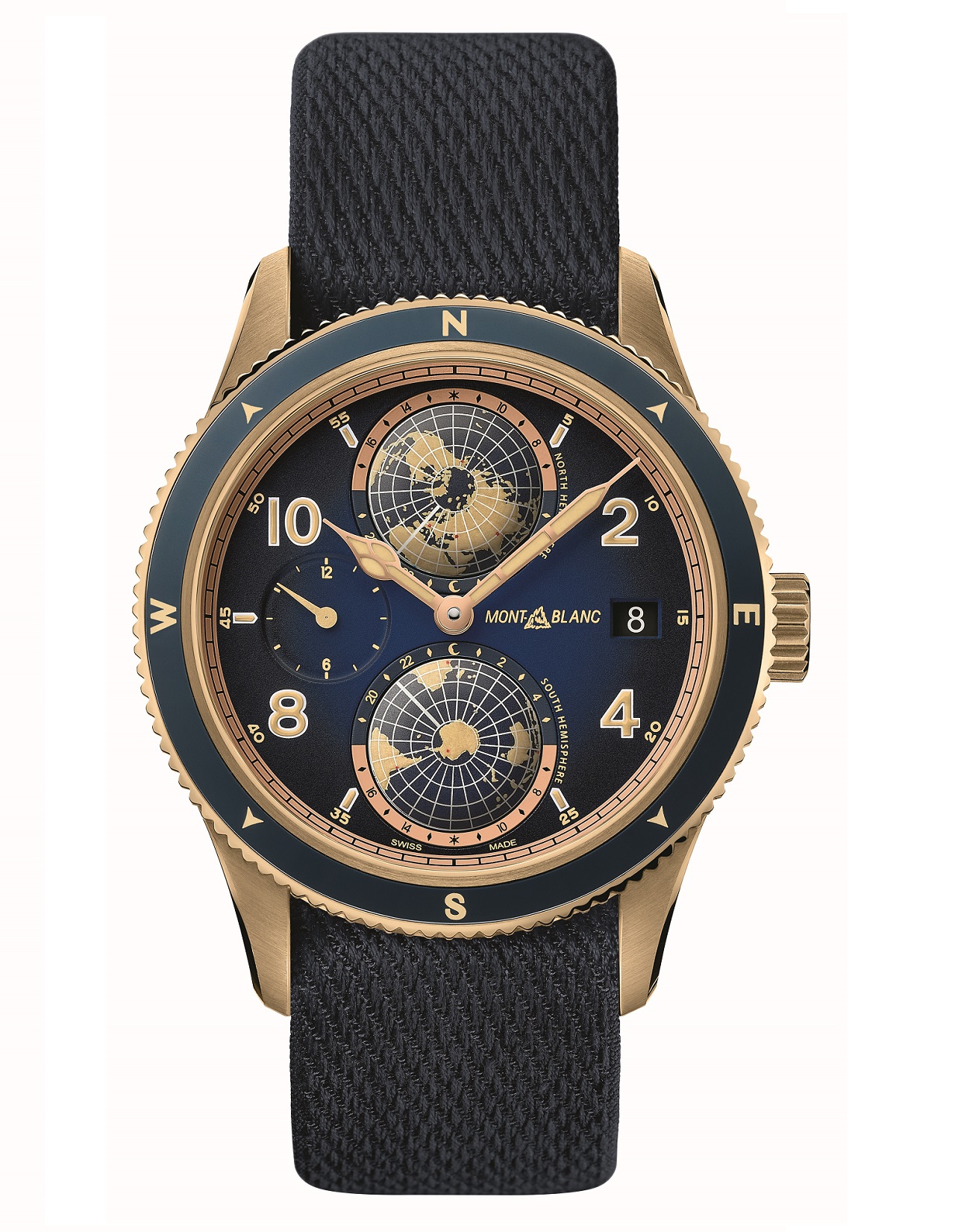 Фирменный индикатор мирового времени в виде двух полусфер, соответствующих Северному и Южному полушариям Земли с 24-часовым циклом вращения и красными отметками Семи вершин, принадлежит мануфактурному модулю, созданному в стенах фабрики Minerva (Montblanc Manufacture Villeret), и в составе калибра MB 29.25 с 4-герцовым балансом и запасом хода в 42 часа базирующемуся на основе автоматического калибра Sellita SW300-1.