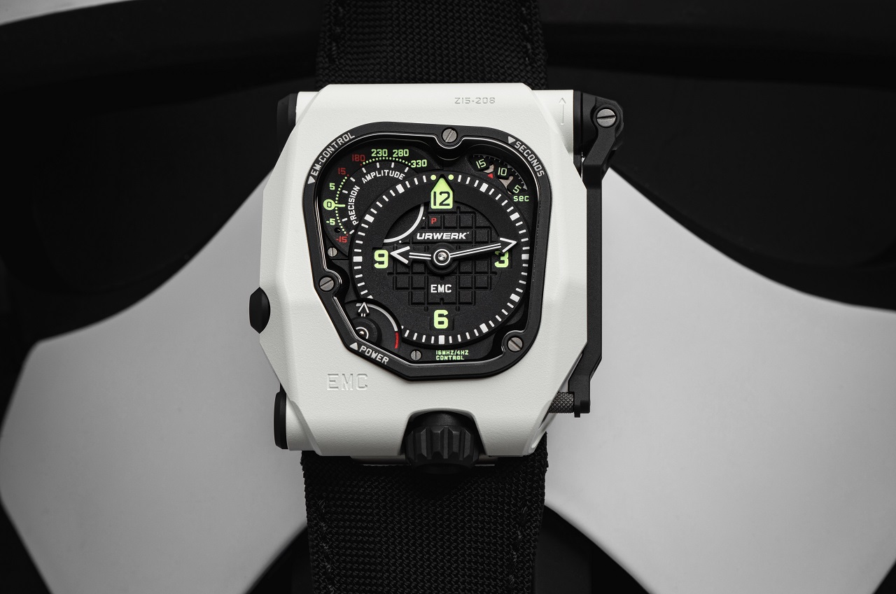 Напомним нашим читателям, что расположенный внутри корпуса калибр UR-EMC2 с ручным заводом, 4-герцовым балансом и запасом хода в 80 часов от двух заводных барабанов может быть отрегулирован владельцем часов (винт Fine Tuning с обратной стороны корпуса) на основании информации о точности хода и амплитуде баланса, собираемой системой EMC и выводимой на циферблат в положении «10 часов».