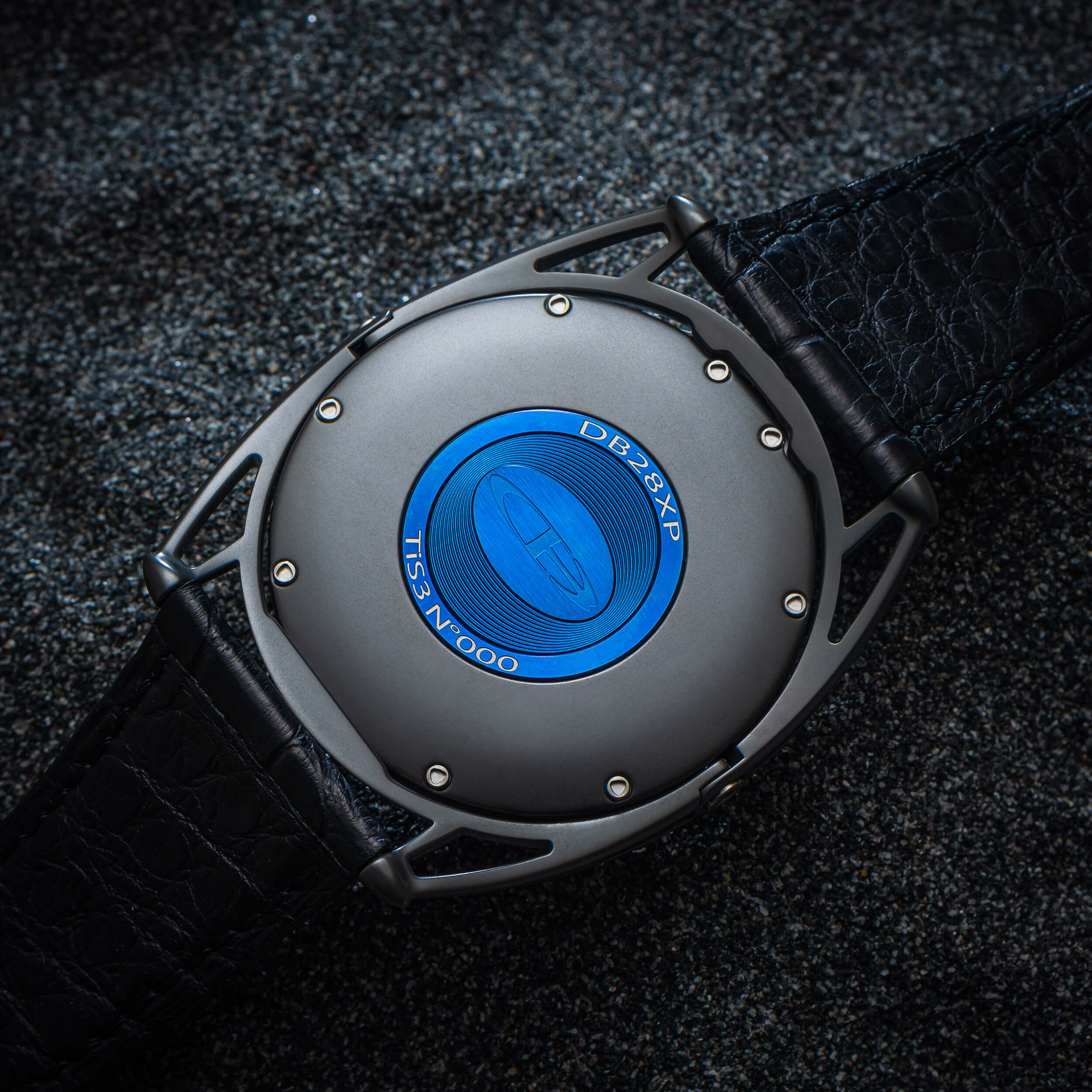 Задняя крышка корпуса также изготовлена из циркония, а ее центральную часть украшает медальон из вороненого титана, информирующий о маркировке модели и порядковом номере часов в составе ограниченной серии (тираж — 10 единиц), а также предлагающий полюбоваться логотипом бренда в окружении декора microlight.