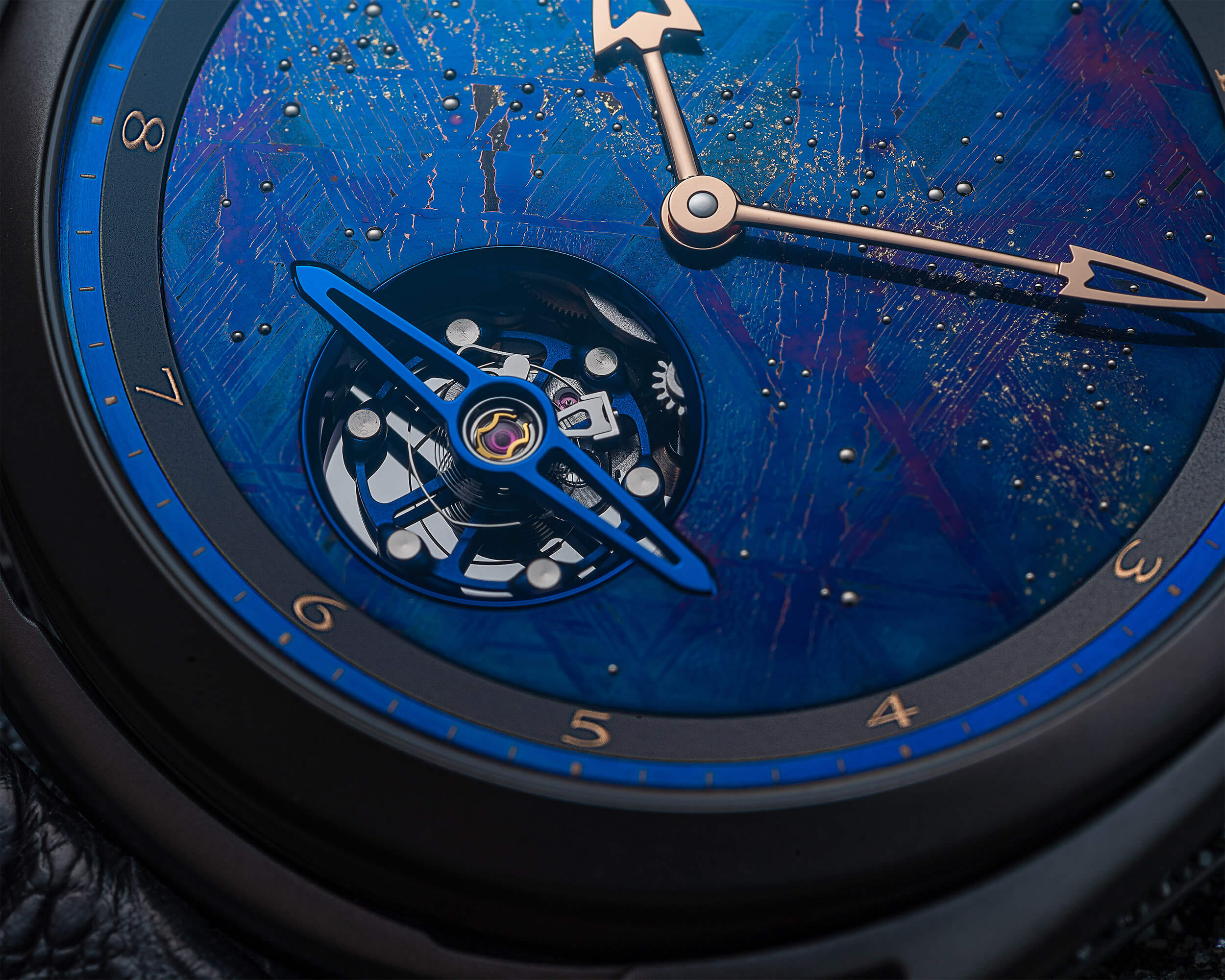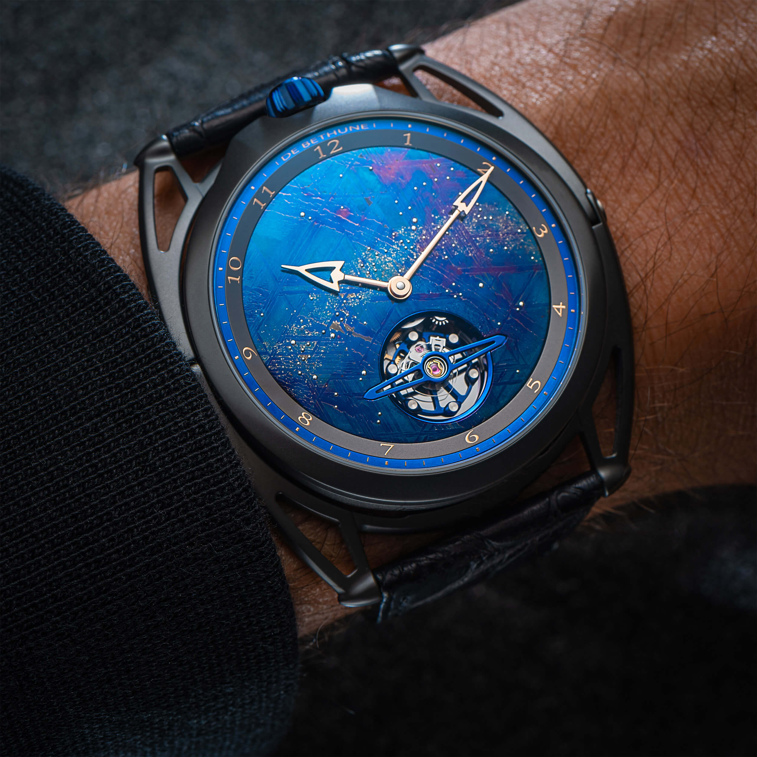 Завершает образ лицевой стороны изделия полученное с помощью крошечных золотых полусфер изображение Млечного пути, вместе с золотыми полированными стрелками оригинальной формы проводящее параллель с моделью DB28XP Starry Sky.