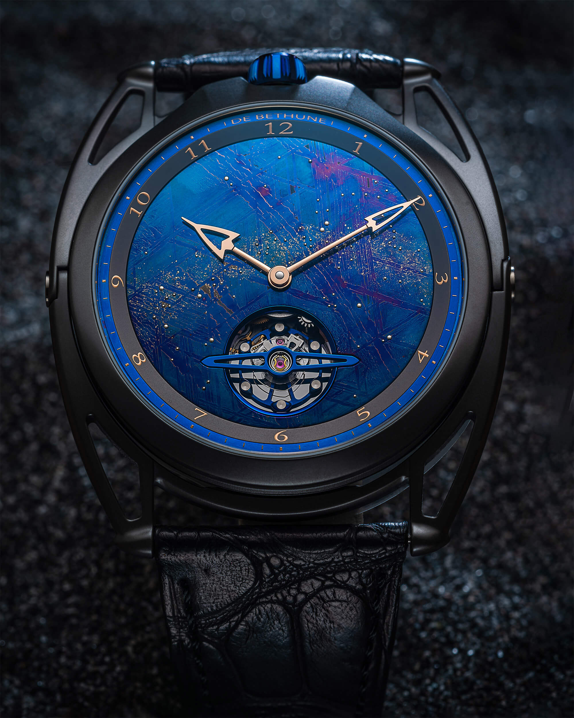Продолжая ряд новых версий представленной в прошлом году модели DB28XP с тонким профилем, часовая марка из Л’Оберсон выбирает для основания циферблата новой модели фрагмент обнаруженного в 1906 году в Швеции метеорита Муонионалуста, на 90% состоящего из железа.