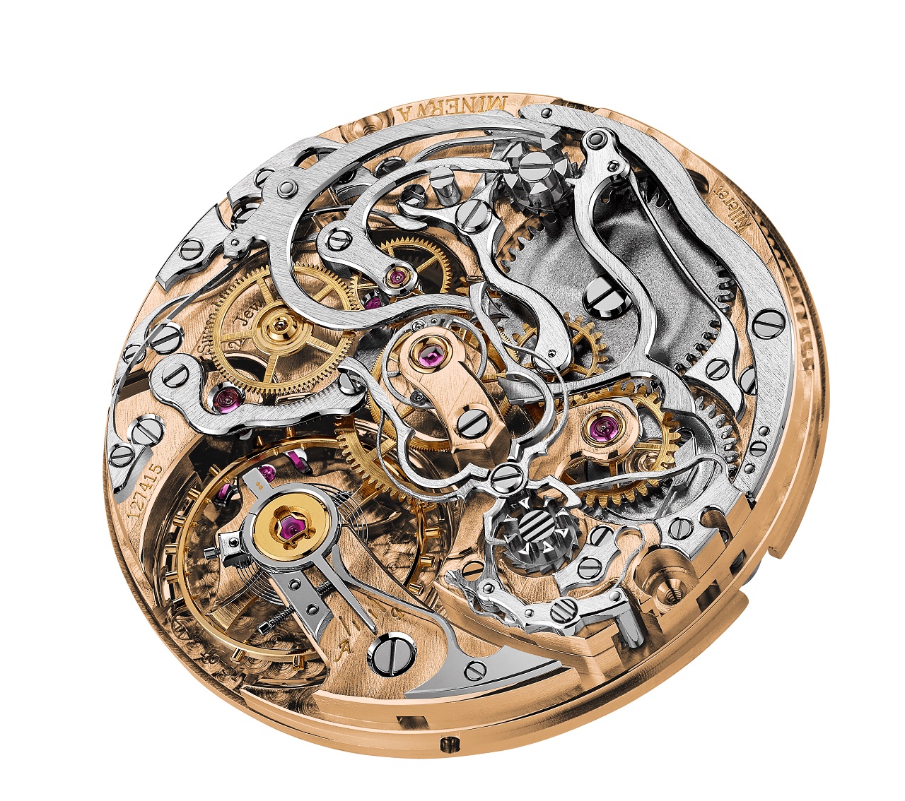 В этих часах платины и мосты механизма изготовлены из нейзильбера, дополнительно получившего покрытие из 18-каратного золота для достижения наиболее полной гармонии с оттенками корпуса и циферблата.