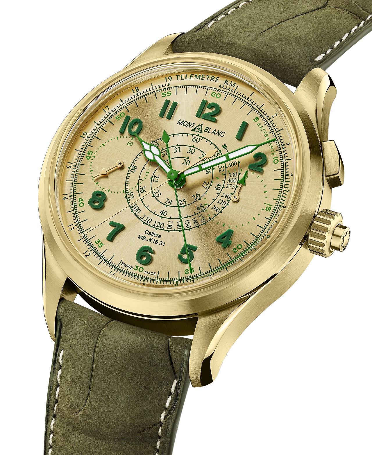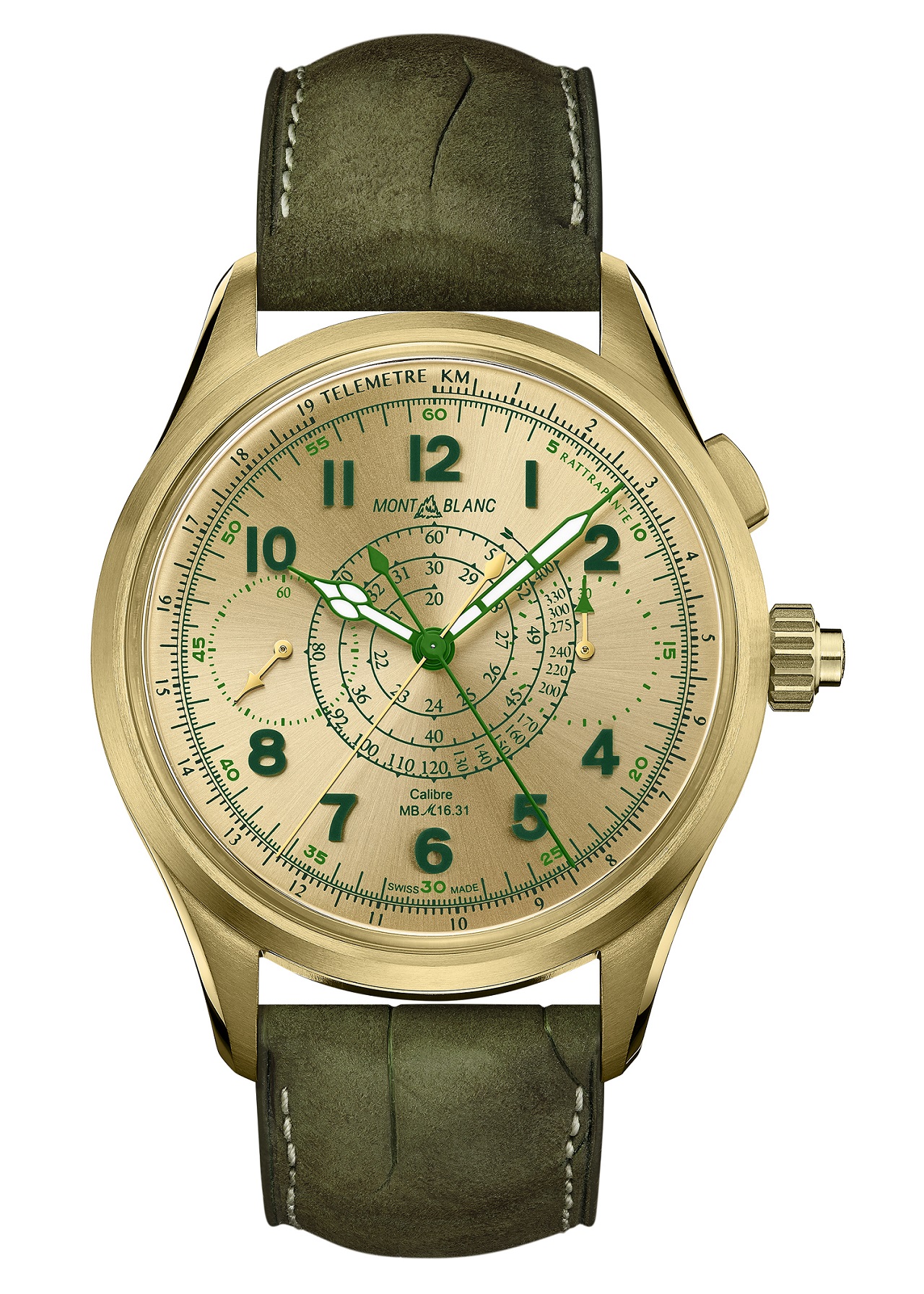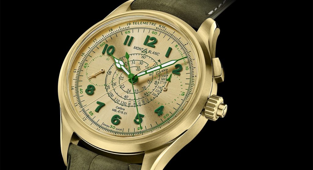 Под стать корпусу выполнен и циферблат с тонкой радиальной шлифовкой, на золотистой поверхности которого с помощью зеленой краски напечатаны телеметрическая и тахиметрическая шкалы, минутная разметка, а также сопутствующие надписи и винтажный логотип Montblanc.