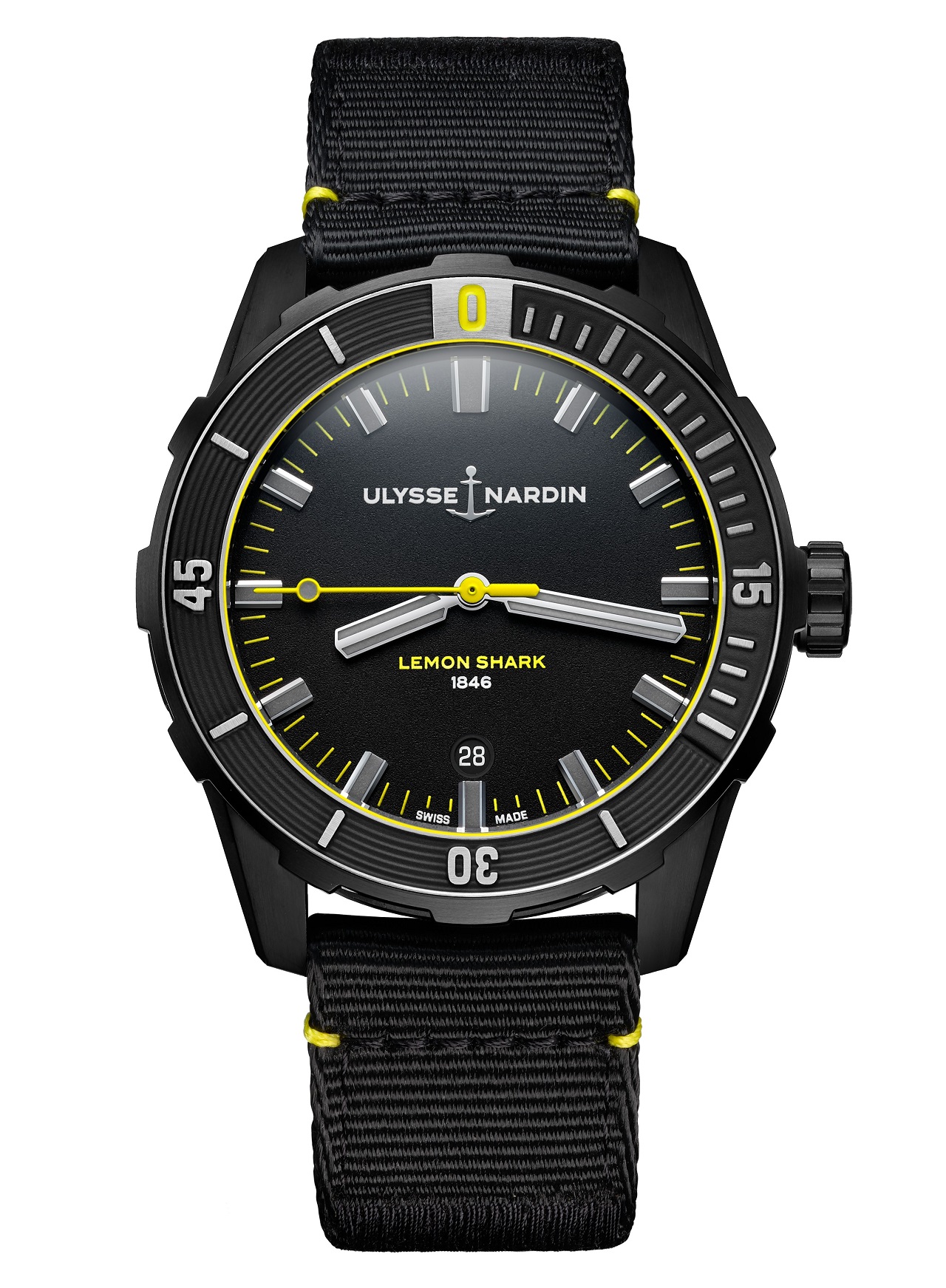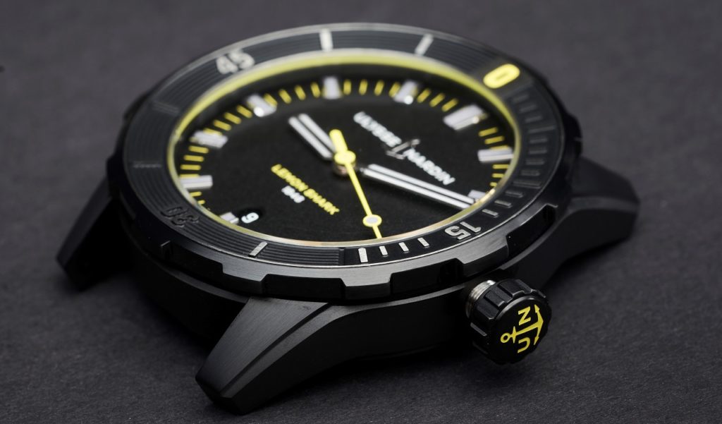 Черный циферблат с матовой отделкой находится в окружении вогнутого безеля с односторонним вращением и 60-минутной дайверской шкалой, а монохромный стиль этих деталей разбавлен яркими акцентами лимонно-желтого цвета, задействованного для надписей, минутной шкалы и центрального секундного указателя.