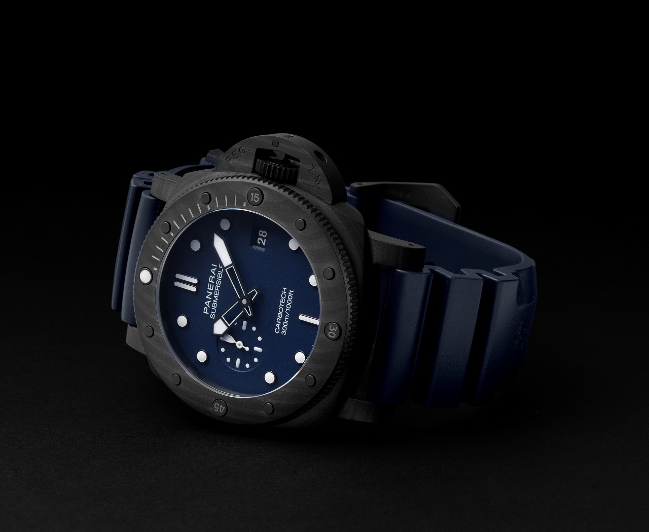 Еще один вариант исполнения — QuarantaQuattro Carbotech™ Blu Abisso (PAM01232) — предлагает в качестве основы для корпуса, безеля и фирменной защитной скобы легкий, прочный и износостойкий материал Carbotech™ на основе углепластика, взаимодействующий с циферблатом глубокого синего цвета.