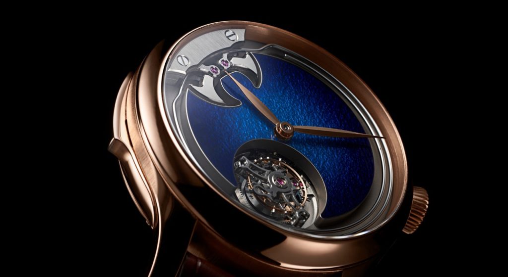 Используя опыт недавней модели Endeavour Centre Seconds Concept Lime Green, компания внедрила эмалевый циферблат с золотым чеканным основанием, поверх которого четыре пигмента сине-голубых оттенков в результате многократного высокотемпературного обжига формируют фирменную градацию цвета Aqua Blue fumé.