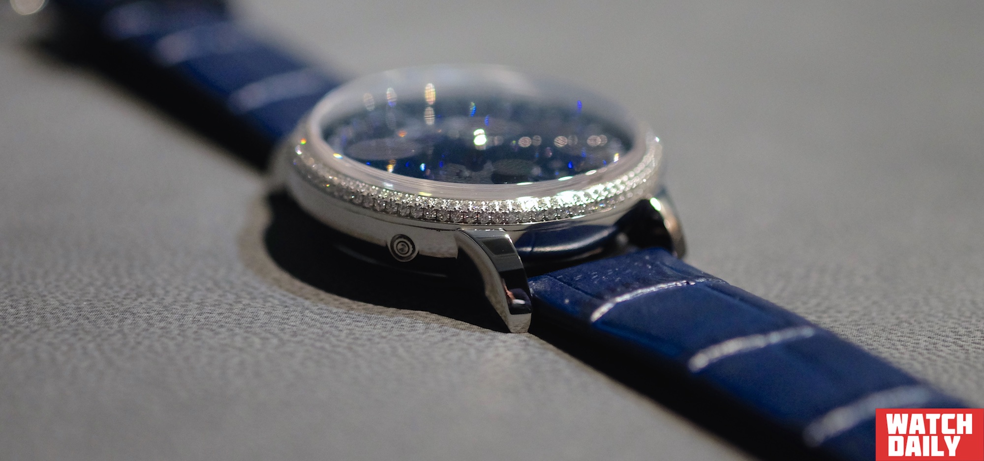Толщина корпуса едва превышает 13 мм, а цвет циферблата уместно оттеняется темно-синим ремнем из кожи аллигатора с раскладывающейся застежкой.