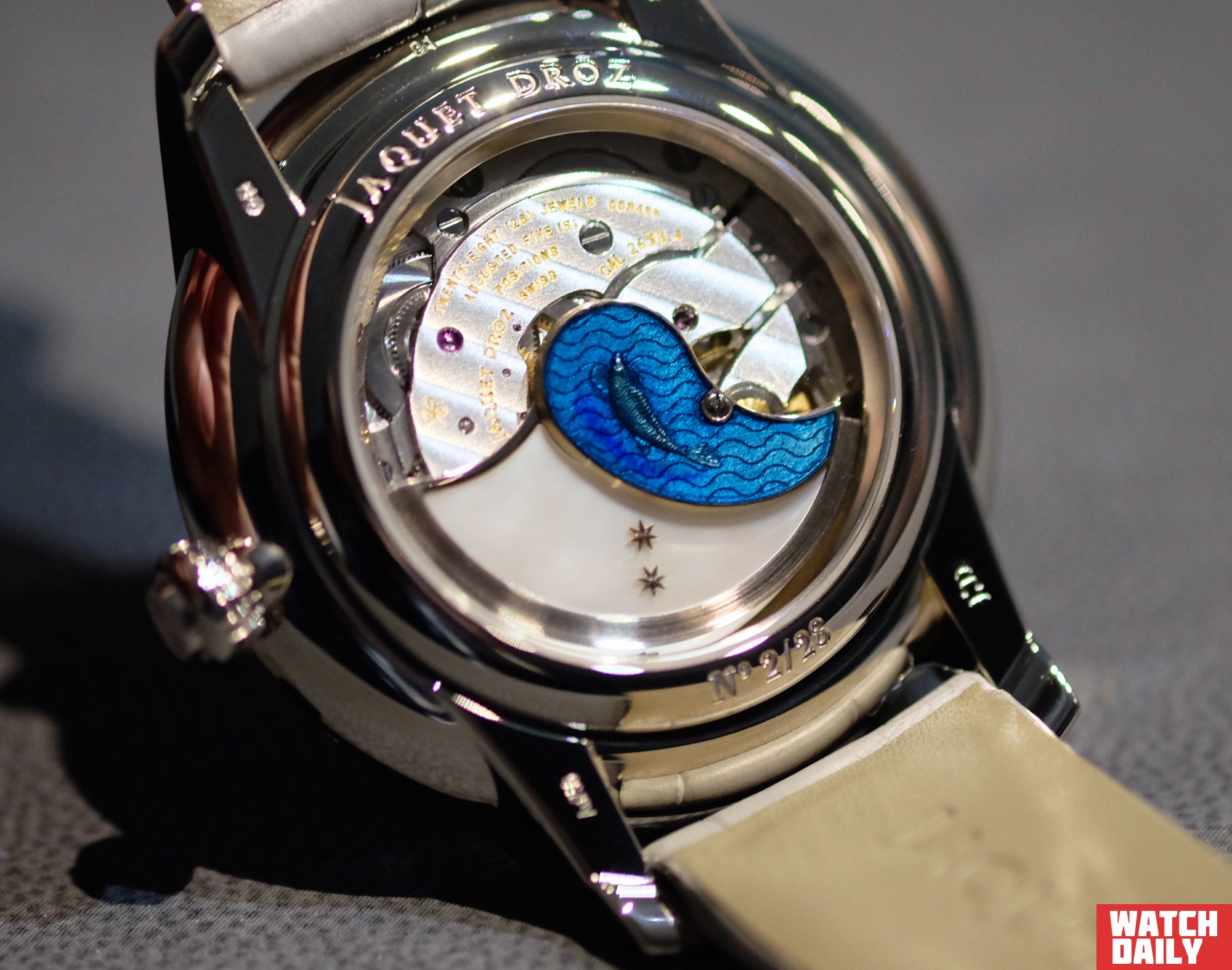 Изображение рыбки также присутствует на золотом роторе автоподзавода (с перламутровой и эмалевой вставками) уже известного механизма Jaquet Droz 2653.
