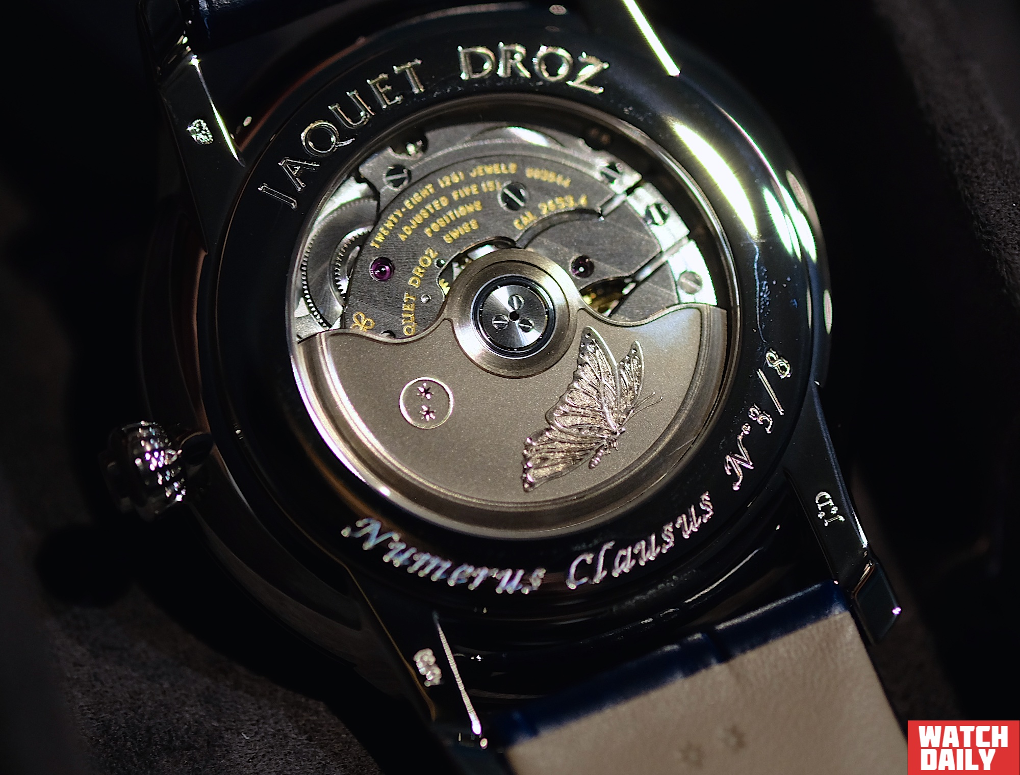 За прозрачной задней крышкой расположен автоматический калибр Jaquet Droz 2653 (база — FP 1150), золотой ротор автоподзавода которого также украшен ручной гравировкой бабочки.