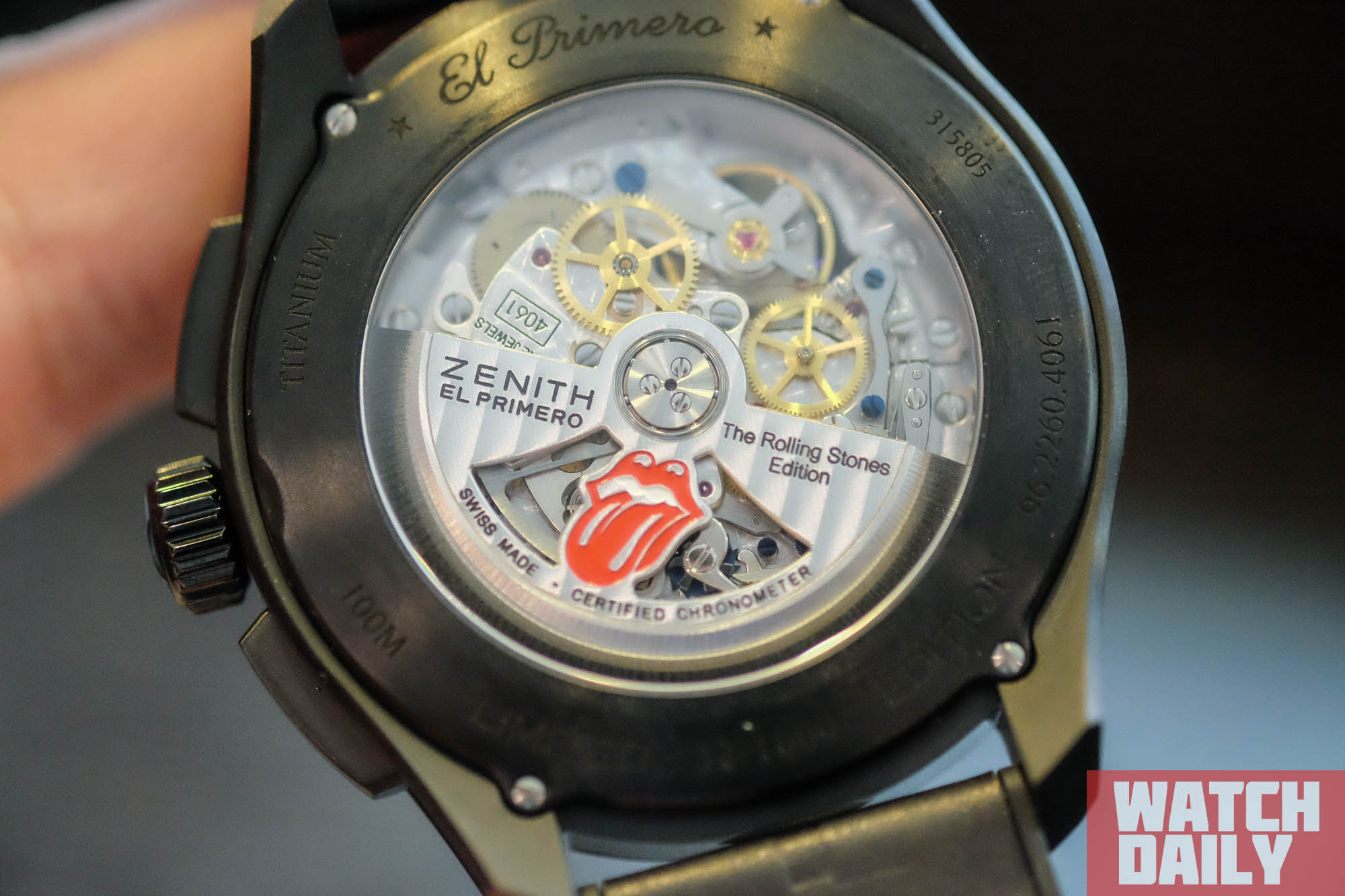 Ротор автоподзавода мануфактурного механизма El Primero 4061 (с кремниевым спуском, видимым через окно в циферблате) украшен символической гравировкой и надписью Rolling Stones Edition.